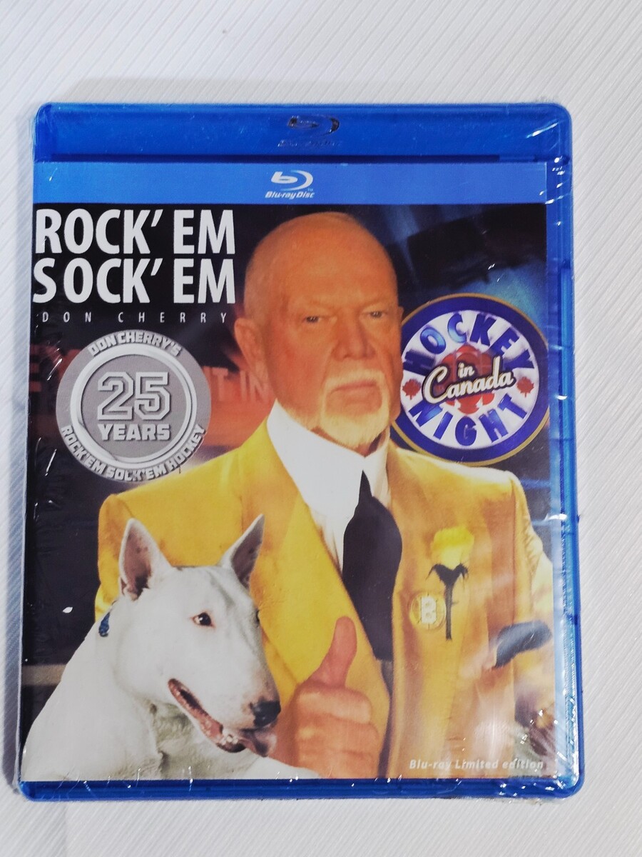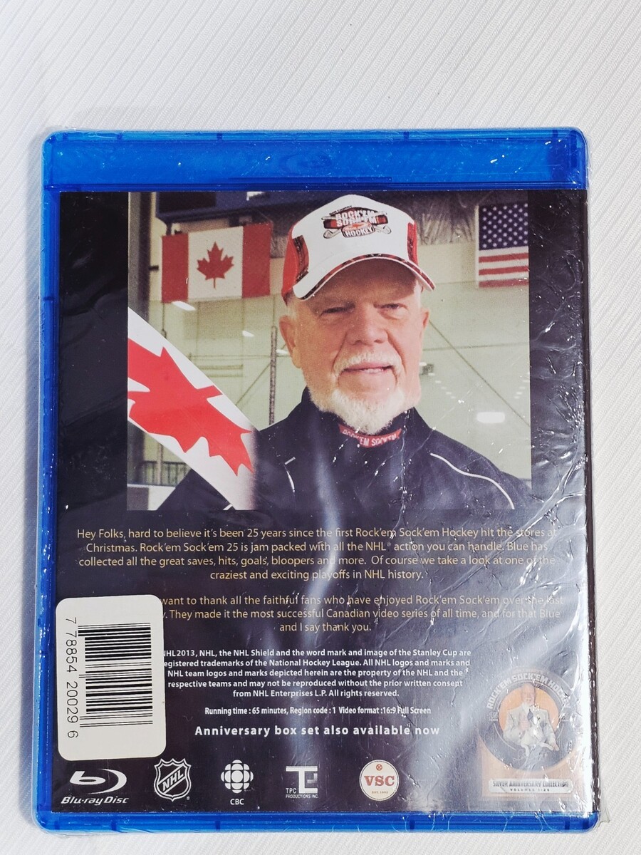 Description of item: Celebrate 25 years of hard-hitting NHL action with Rock ?Em Sock ?Em Hockey: Don Cherry 25 Years on Blu-ray. Hosted by legendary hockey personality Don Cherry, this special anniversary edition delivers classic goals, bone-crushing hits, spectacular saves, bloopers, and unforgettable playoff moments from across NHL history. Featuring high-definition presentation and iconic Cherry commentary, this Blu-ray is a must-have for hockey fans and collectors alike. A limited edition release that captures the passion, toughness, and excitement that made Rock ?Em Sock ?Em a staple of hockey culture.