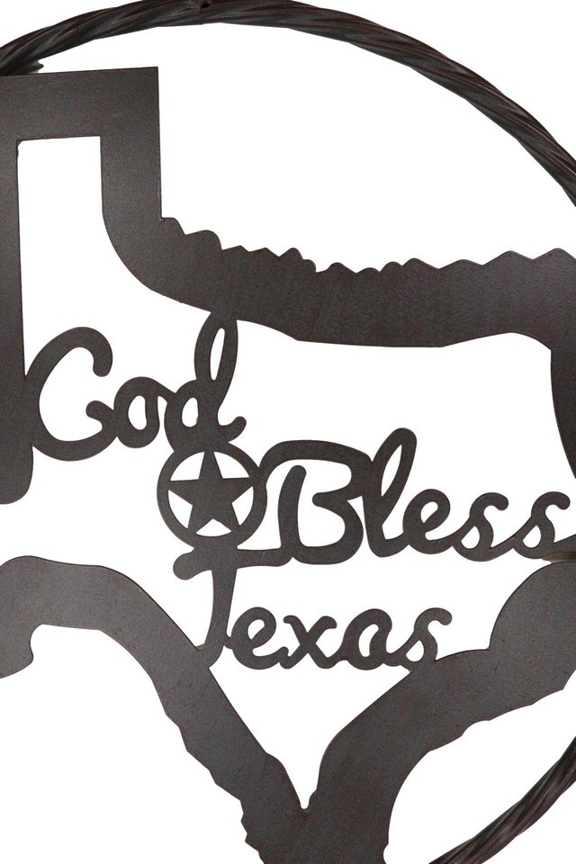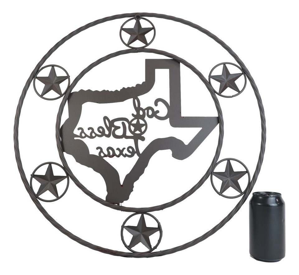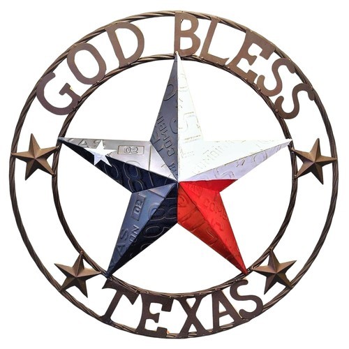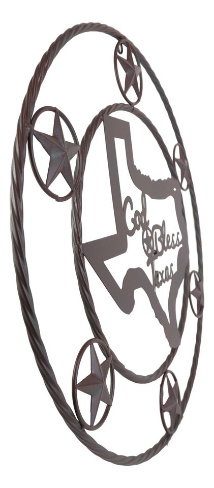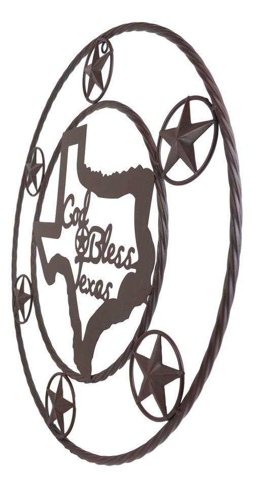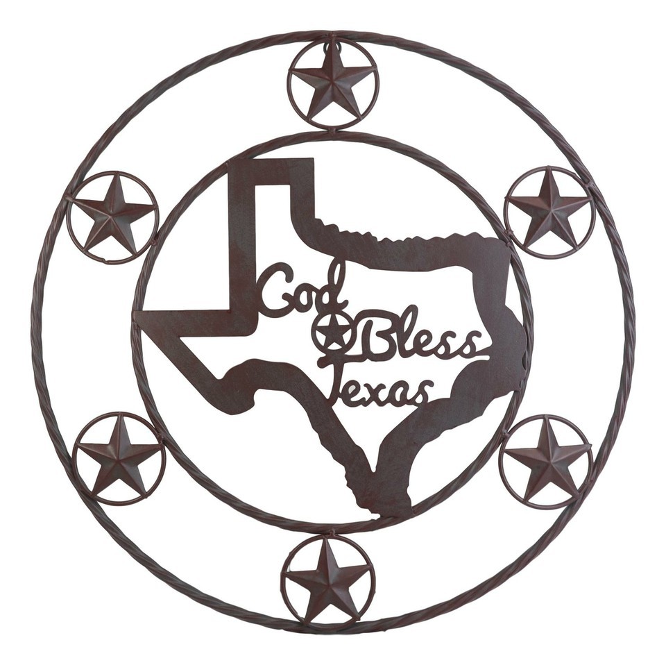 ? The circle wall sign features 6 small western stars encircling a Texas Map with the words God Bless Texas in the center.