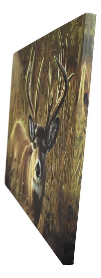 ? Add brilliance in color and exceptional detail to your space with rustic western and uncompromising style. Greeting the sun as it rises at dawn, the impressive Emperor Red Deer Stag rises above the tall grasslands. Its head is slightly bowed as it senses imminent danger with the sudden quietness in the horizon. The scenic Deer view is as if you were scoping it in a great distance as you stalk its movements. Majestic!
