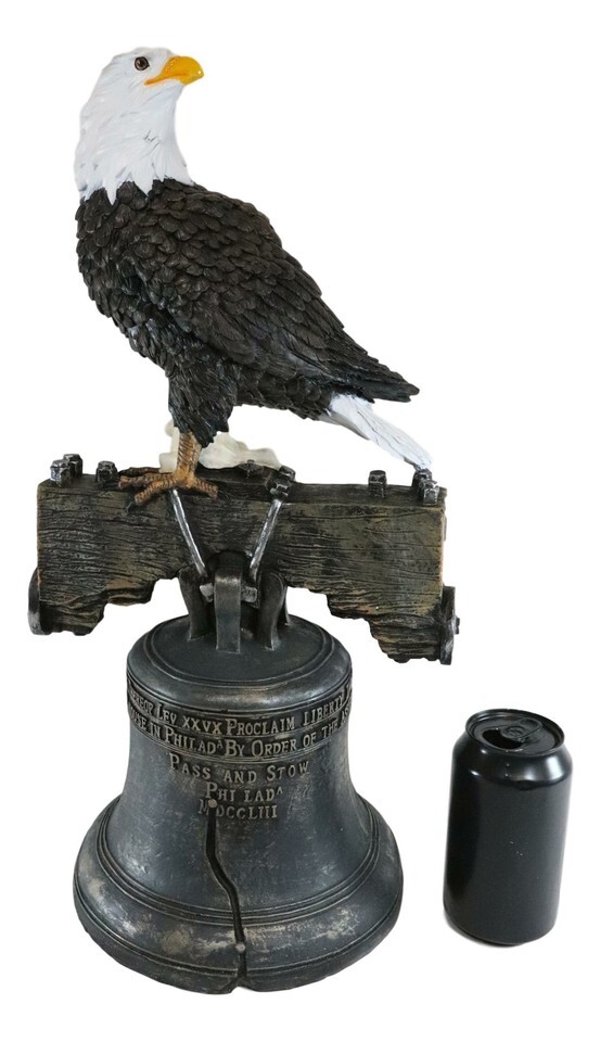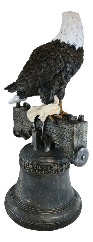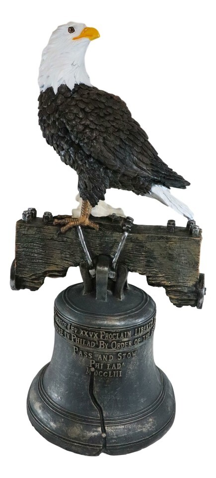 ? This stunning patriotic statue, titled `Let Freedom Ring`, features a majestic eagle perched atop a replica of the Liberty Bell. On the surface of the bell, at the top line are the words "Proclaim liberty throughout all the land unto all inhabitants thereof." The next two lines are also engraved with the words found in the actual Liberty Bell itself.