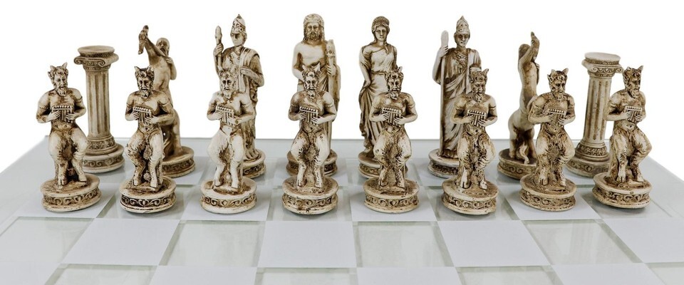 ? This Olympian Greek Gods chess pieces are made of polyresin, hand painted and polished individually. They are furnished with felted base. The board is made of frosted glass.