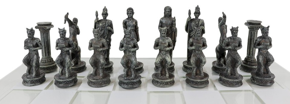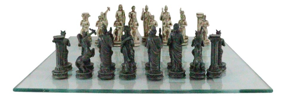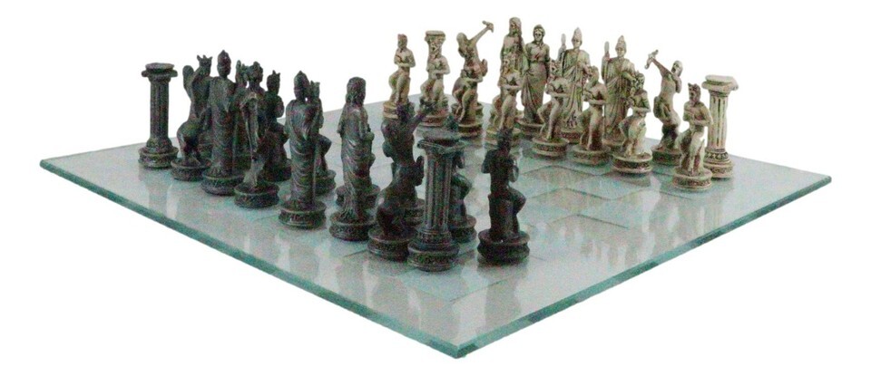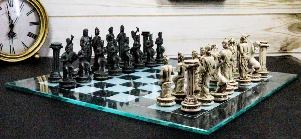 Ebros Olympus At War Greek Olympian Deities Resin Chess Pieces W/Glass Board Set