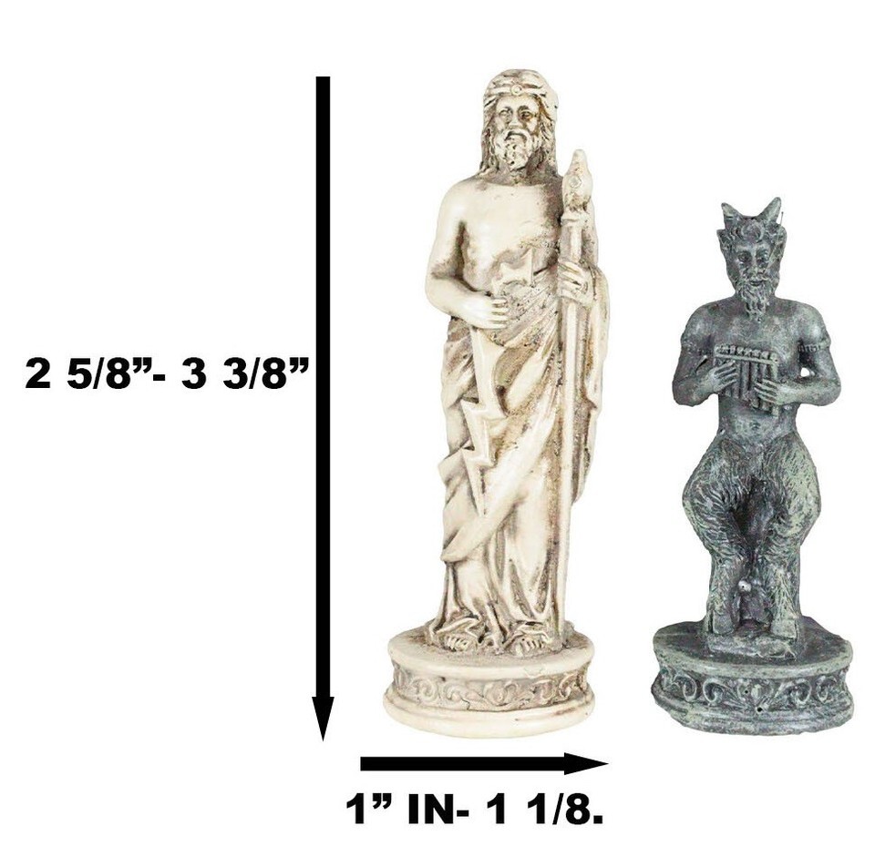 ? Olympian Gods chess pieces has an approximate height of: 3.75" Tallest 2.5" shortest piece. Base diameter 1.25"