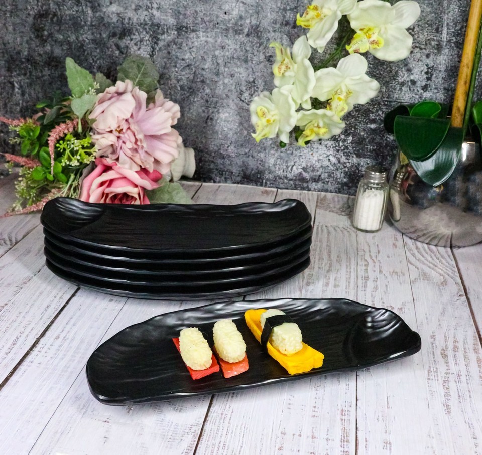 Pack Of 6 Half Moon Matte Black Melamine 2 Partitions Sushi Plates Platters 11"L