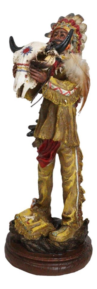 ? This Indian Warrior Chief With Ox Skull Figurine is made of polyresin, hand painted and polished individually. Color Tone May Vary slightly from pictures.