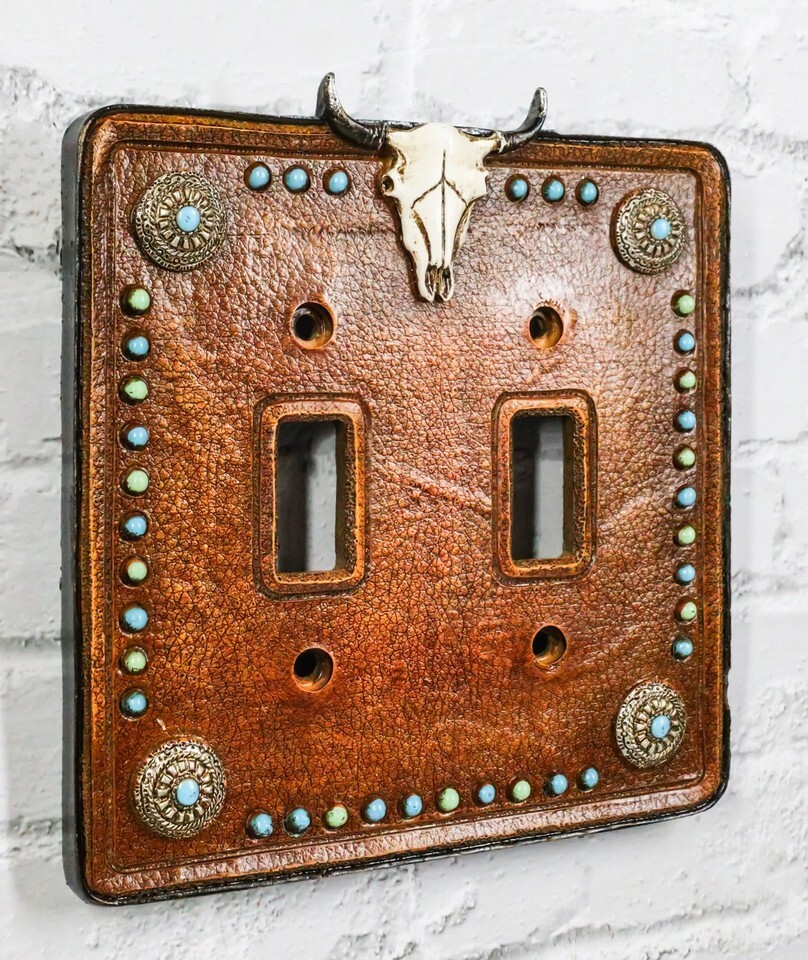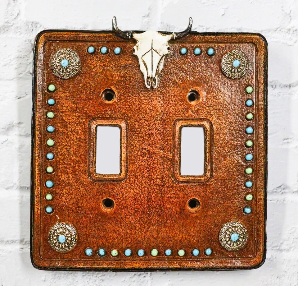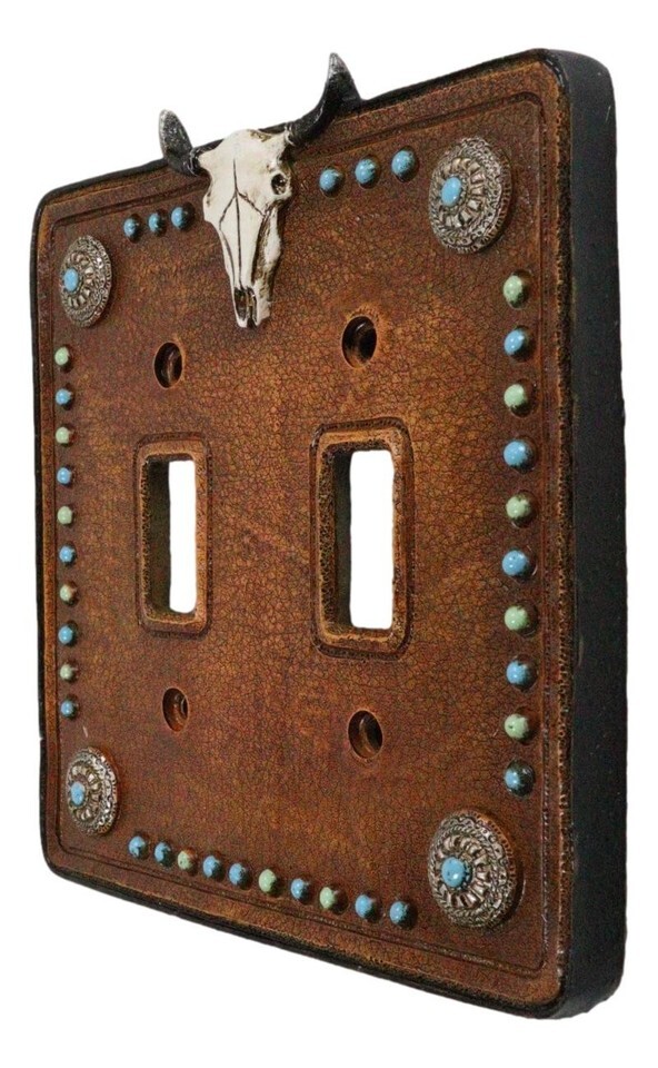 Set of 2 Western Cow Skull Turquoise Conchos Wall Double Toggle Switch Plates