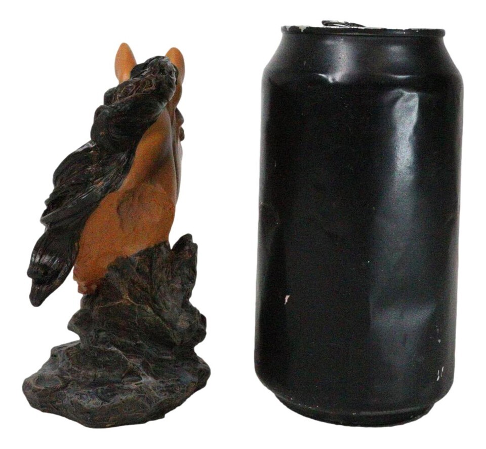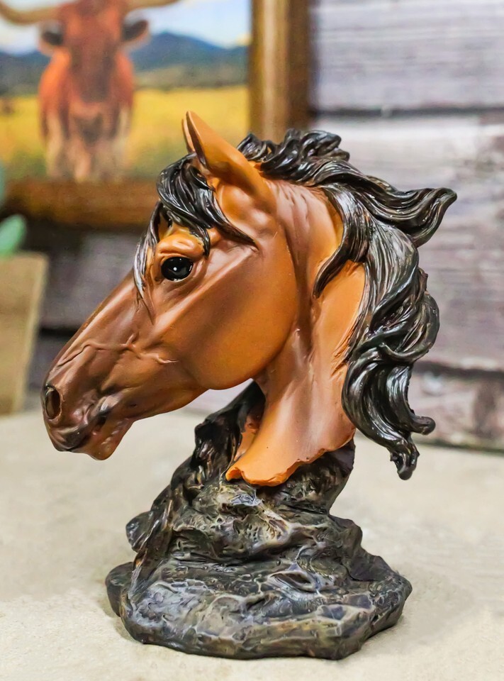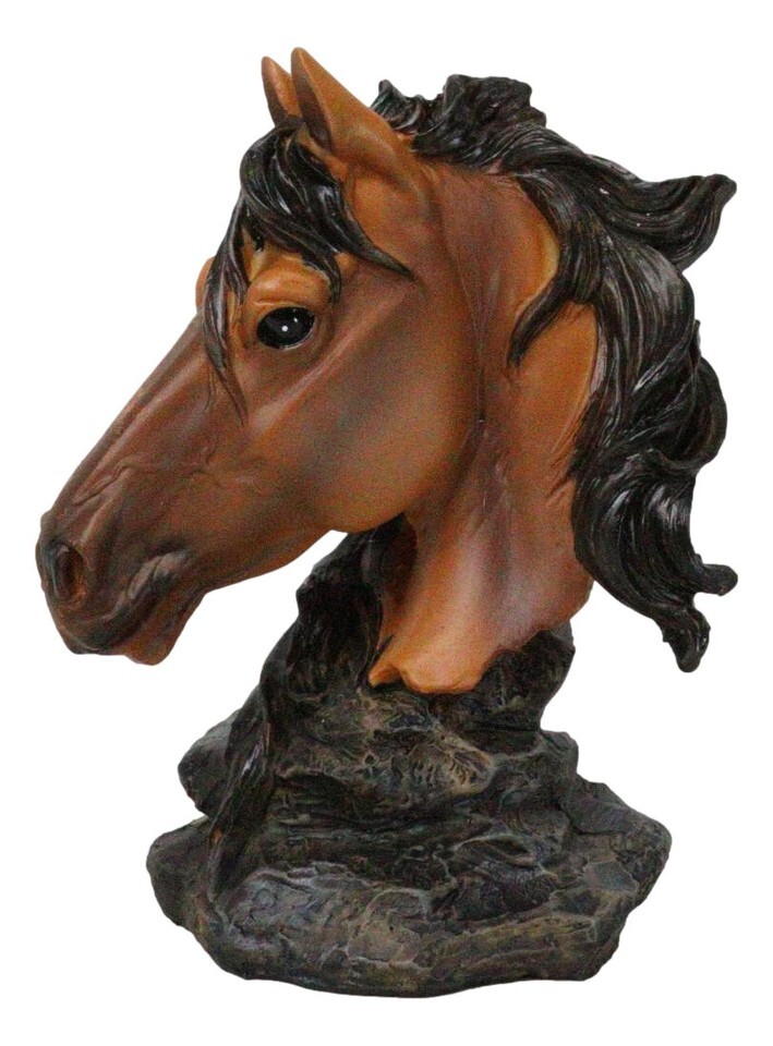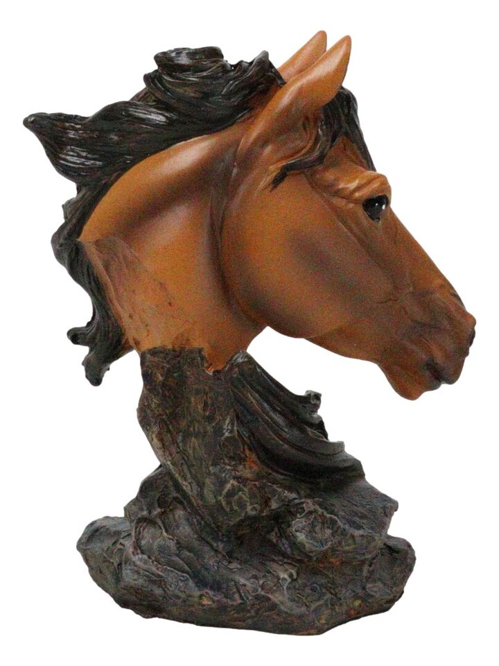 Wild and Free Brown Stallion Equine Horse Bust On Rocky Pillar Base Figurine