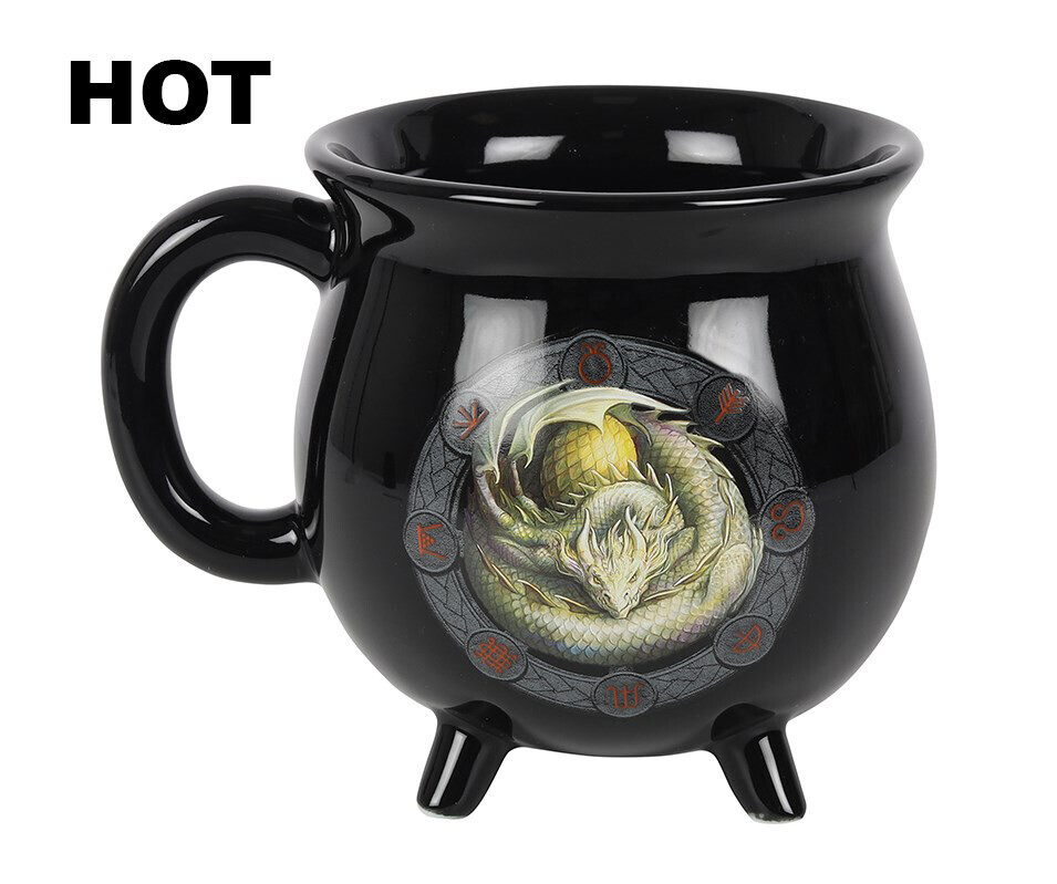 ? Designed By Gothic Award Winning Guild Artist Anne Stokes From The United Kingdom. The heat color changing 'magic' mug is a unique bonus feature of the exotic fantasy mug. The sabbat symbols spaced out on the dragon scales halo wheel which surrounds the dragon image at the center turns fire orange as you pour a hot beverage into the mug. Refer to the images that are marked Hot and Cold to see the effects.