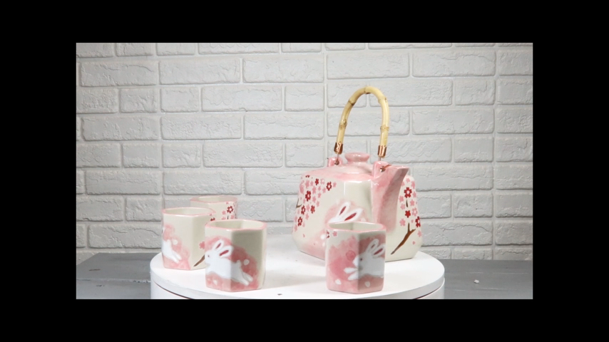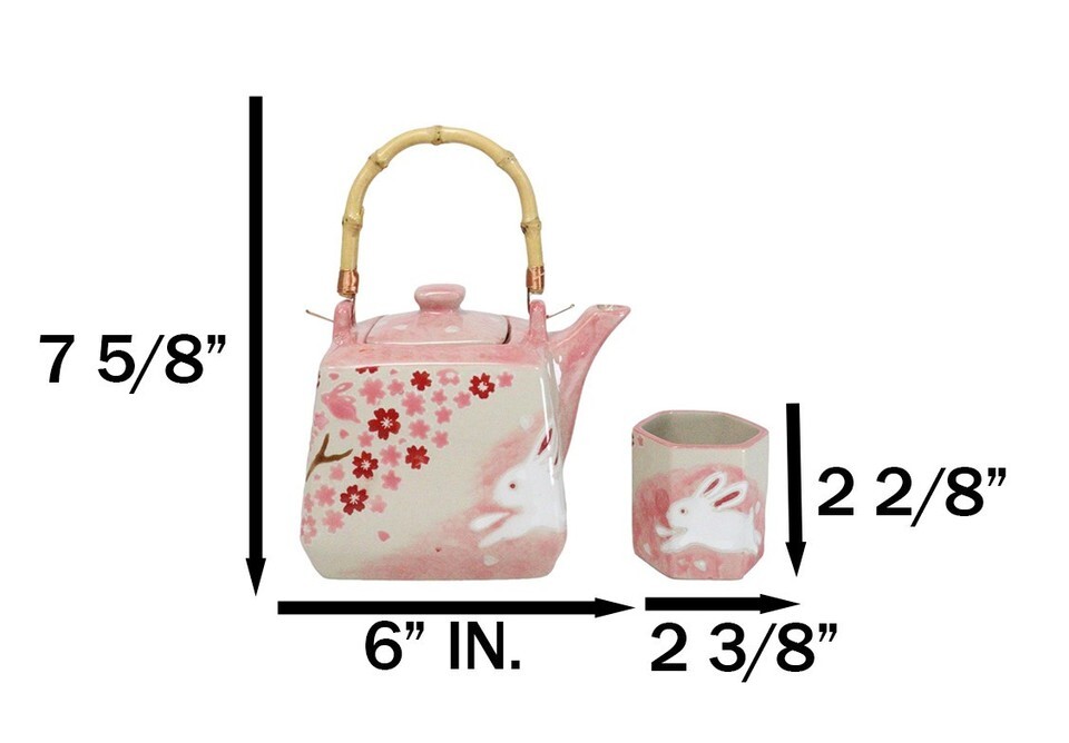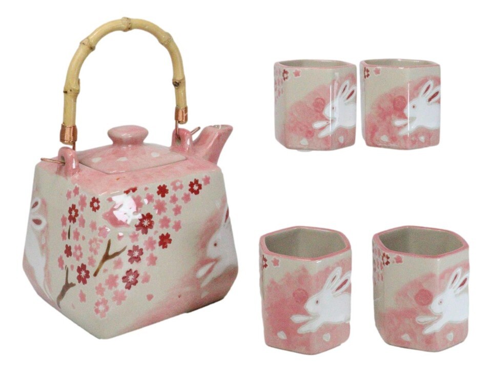 Pink Sakura Cherry Blossoms With Rabbit Hexagonal Teapot With 4 Tea Cups Set