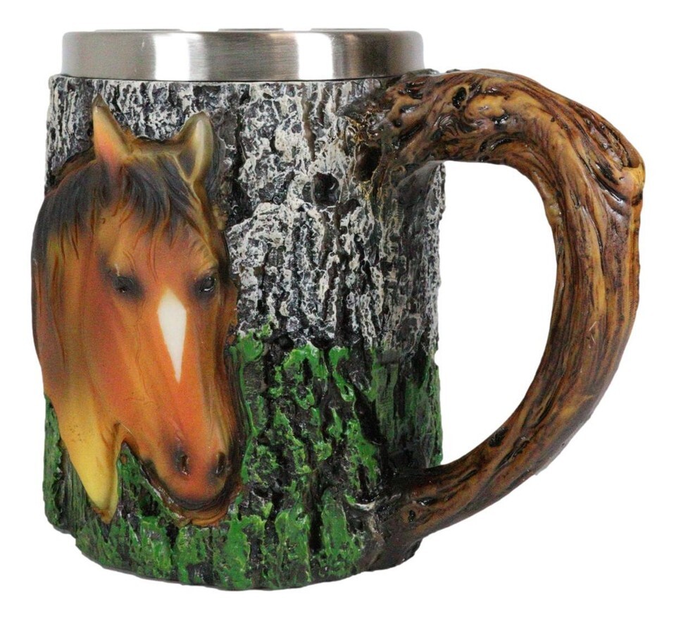 ? If you are a lover of wildlife nature, outdoors, farmland, then you wont want to pass up on this amazing mug! It features a chestnut horse bust one side of the mug and around the horse, the mug is designed with a tree bark finish with smooth woodlike brown handle.
