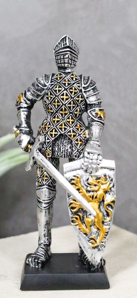 ? A royal knight is arraigned in silver and gold, wearing a heavy battle armor suit and carrying a sword and large lion hearldry shield in his hands. He is of the elite order of the chivalrous knight, putting his life on the line to defend his King and Country.