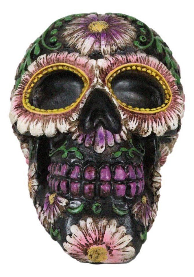 ? This Black Floral Sugar Skull figurine is made of high quality polyresin. It is meticulously hand painted and polished. Color tone may vary from pictures.