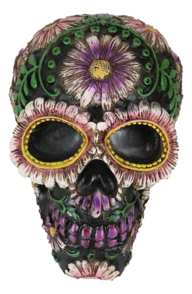 ? Decorate your home for the halloween, day of the dead season or any season with this elaborate skull. This skull is cast in black medium color for a dark sharp contrast against the ornate detailed floral designs in multi colors. He makes a perfect altar decoration, shelf collectible or desktop decor!