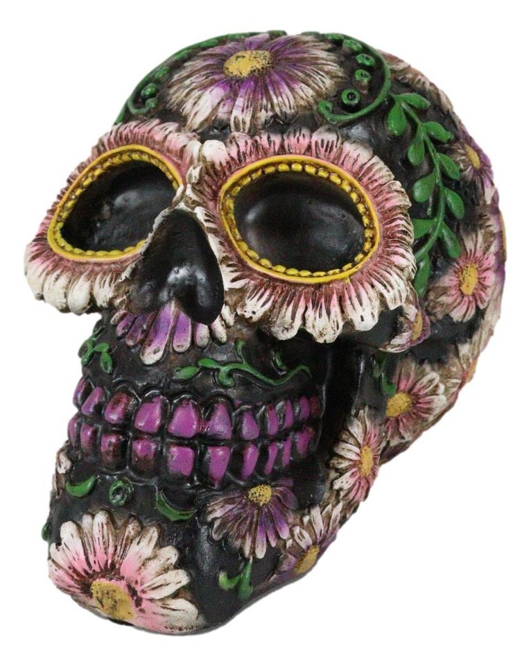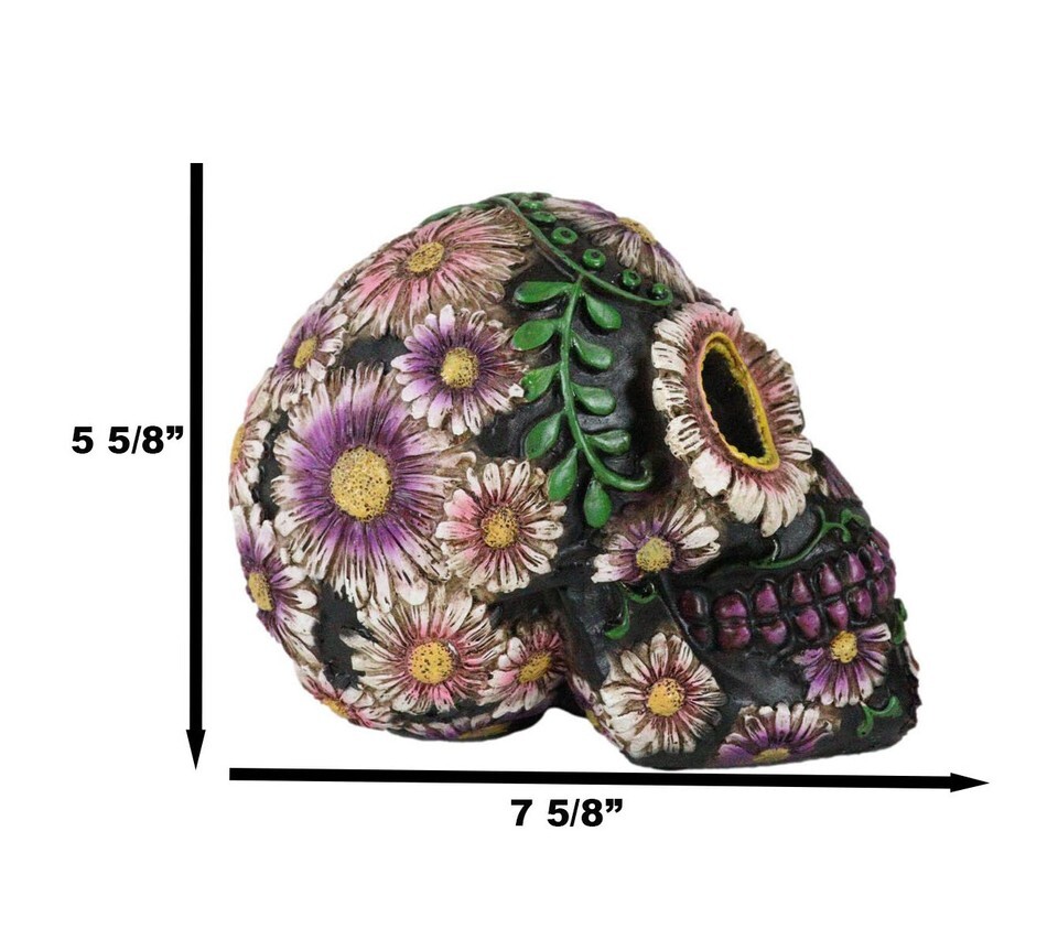 Black Day of The Dead Purple Fuchsia Floral Blooms Sugar Skull Figurine 7.5"L