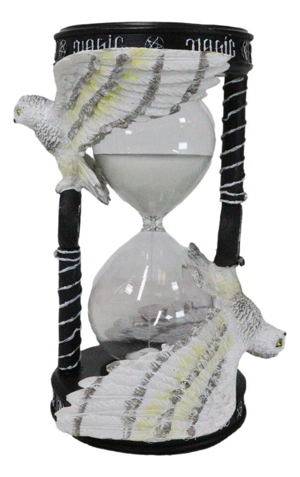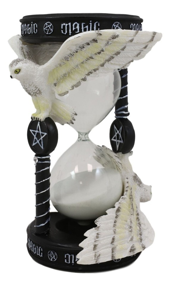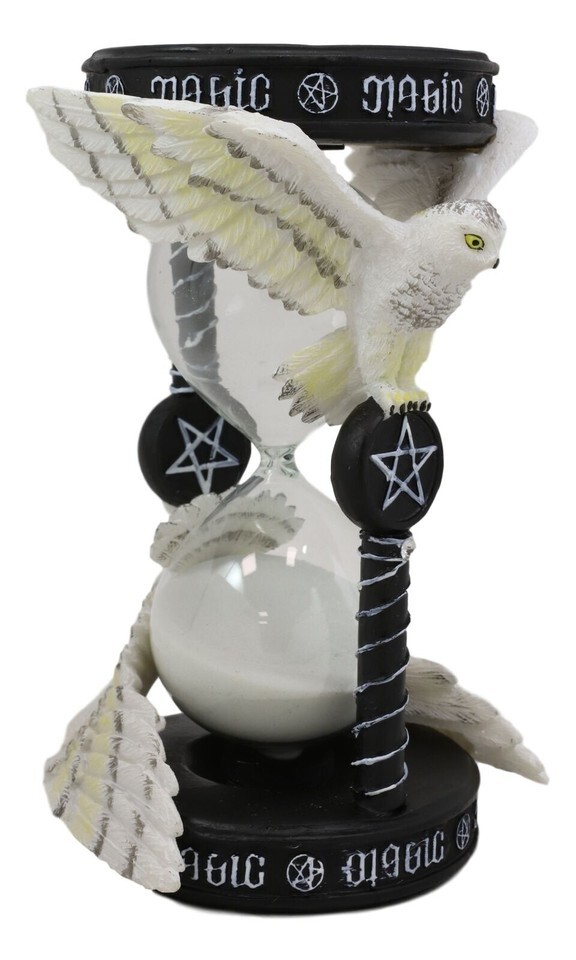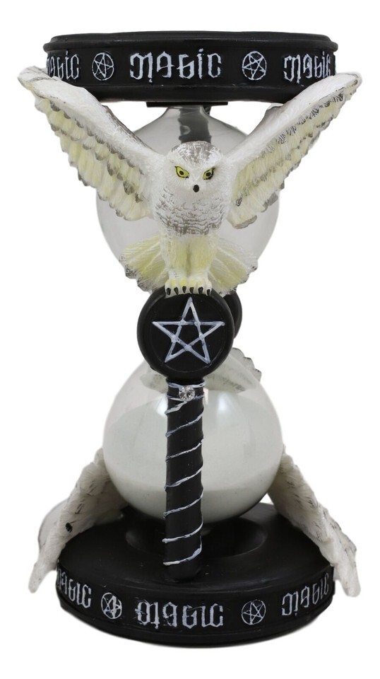 ? From Gothic and fantasy artist Anne Stokes. Inspired by her Awake Your Magic art which features a Snowy owl gliding through the sky grasping a pentagram pendant between its talons. The sand timer features two owls, above them is ambrigram of MAGIC which can be viewed from any direction or perspective.