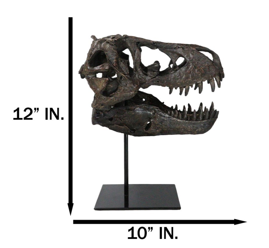 ? This Tyrannosaurus Fossil Skull Replica Statue measures 11.5" tall, 10.25" wide and 5.5" deep approximately.