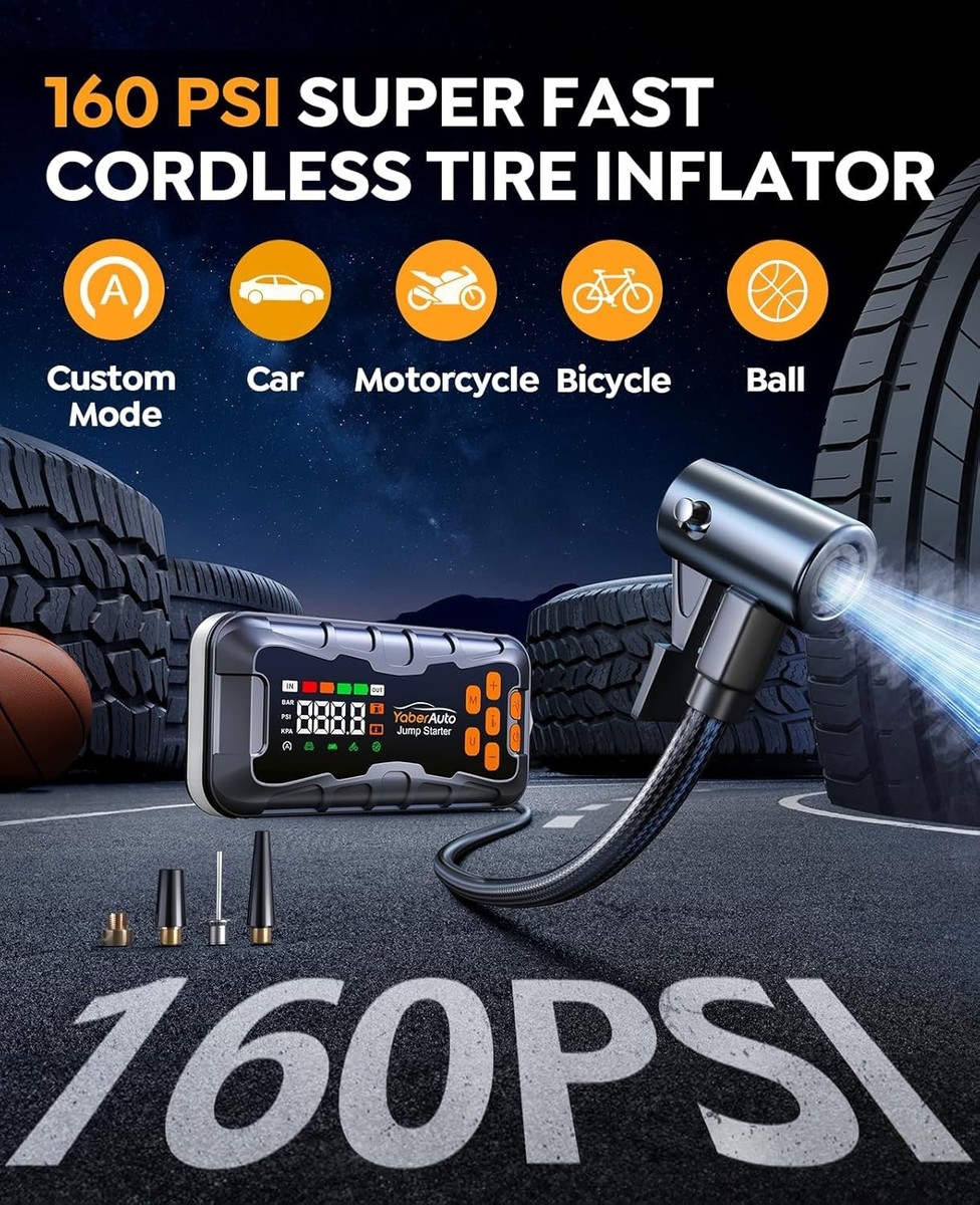 Only 3 steps to go-- smart preset, fast inflate and auto shut-off. Driven by higher turbo 45L/Min (160PSI), portable car jump starter with air compressor inflates a car tire to 30 PSI in just 2 minutes. 5 inflation modes, 4 air nozzles, 3 inflation units and a detachable air hose for all cars, motorcycles, bikes, balls, etc. Large 3.3-inch screen, visible in sunlight, 1 PSI precision, auto memory, no overinflating.