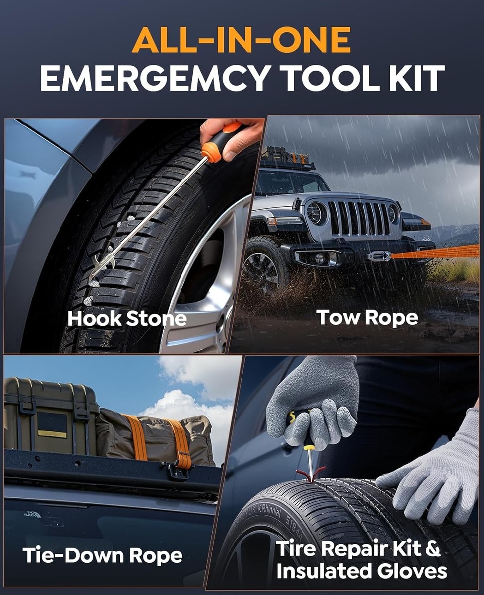 2026 Newly AP03 is more versatile than general jump starters, integrates 16 multiple functions to meet all your needs, including 8000A car emergency start, 160PSI tire inflator, pressure gauge, 99.9Wh power bank, emergency tool kit bag, 2-in-1 hook stone, 400V insulated gloves, tire repair kit, tow rope, luggage tie-down, car escape hammer and 4 modes lights. Powerful, versatile and must-have road trip kit.