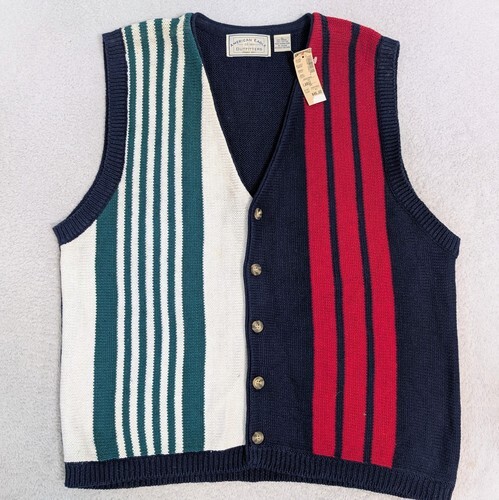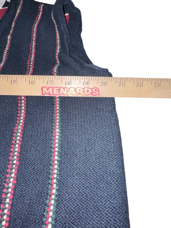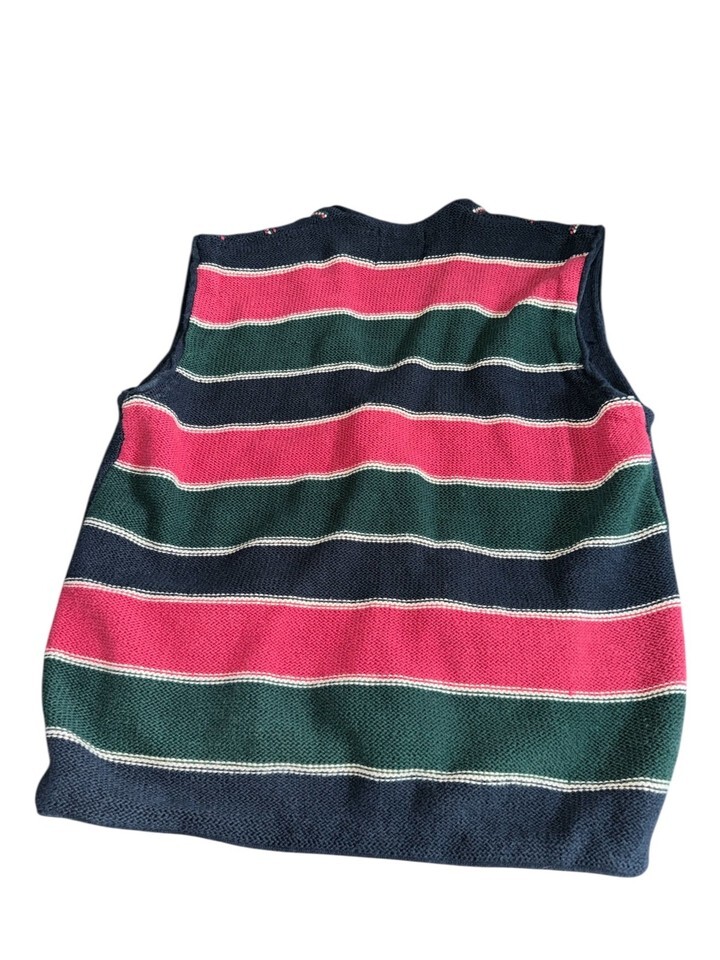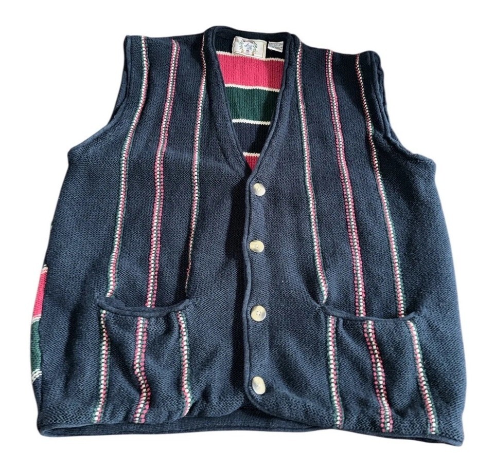 Vintage Sears ?Since 1886? knit sweater vest in size Large. Ramie/cotton blend with a soft, textured knit. Navy front with vertical multicolor stripes and a bold striped pattern on the back. Button-front closure and front pockets. Classic 80s/90s style. Everybody?s perception of condition is different so please refer to pictures of the item for they are a large part of the description. Please zoom in on all pictures and see for yourself. Colors may vary due to lighting and screen settings.