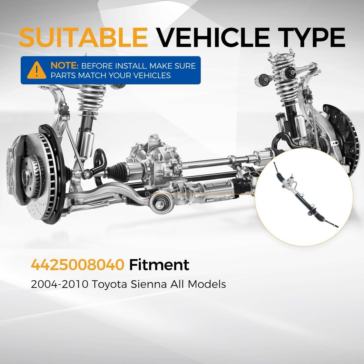 Confirm your vehicle?s existing part number and steering type match this rack. This is a direct replacement for part number 4425008040 ? it may not fit vehicles with alternate steering rack configurations.