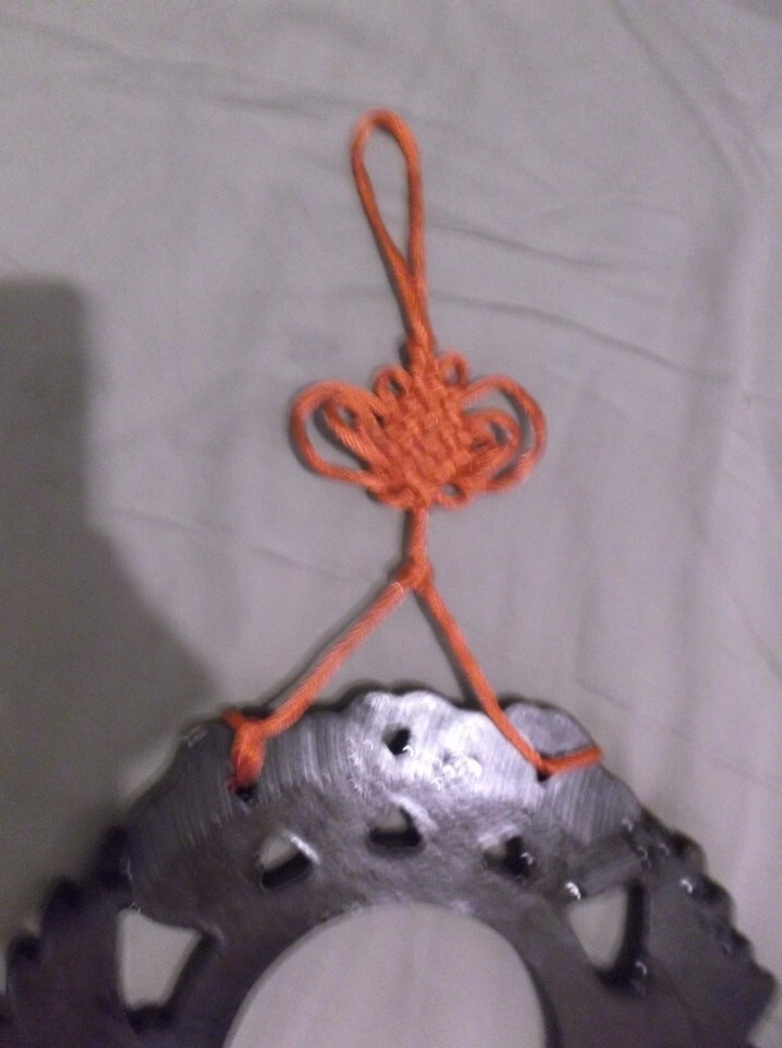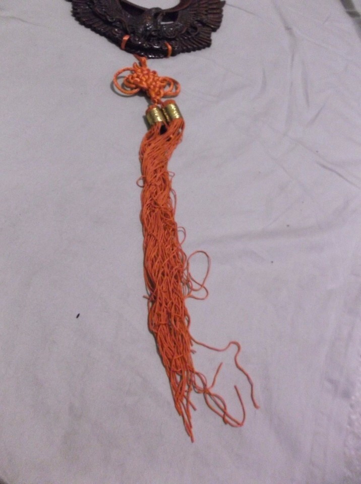 This piece is in overall Great Condition. The bottom tassels are not as perfect as they once were and I believe there was something glued into the center circle at first (there is a little glue residue left on it).