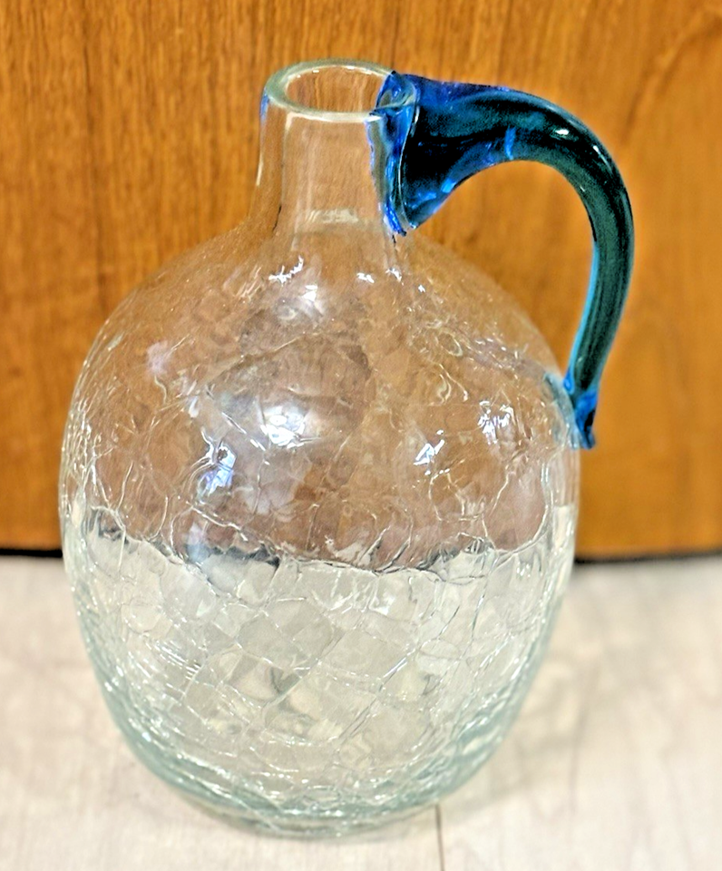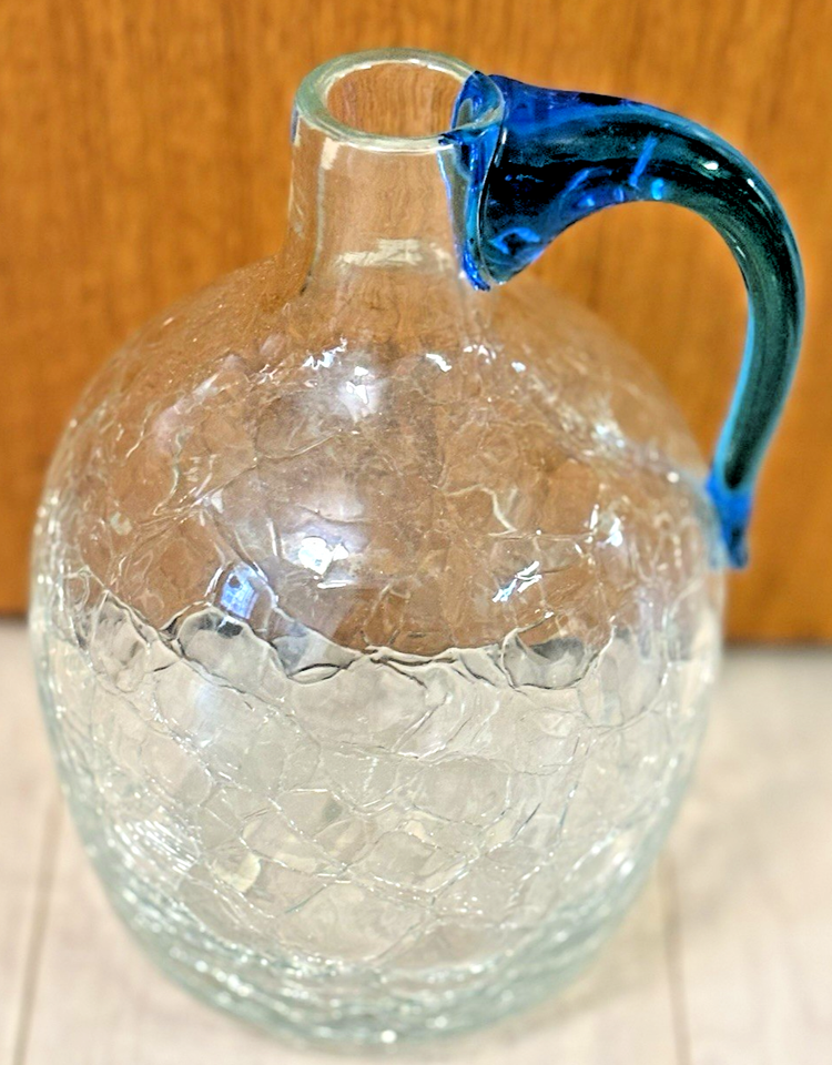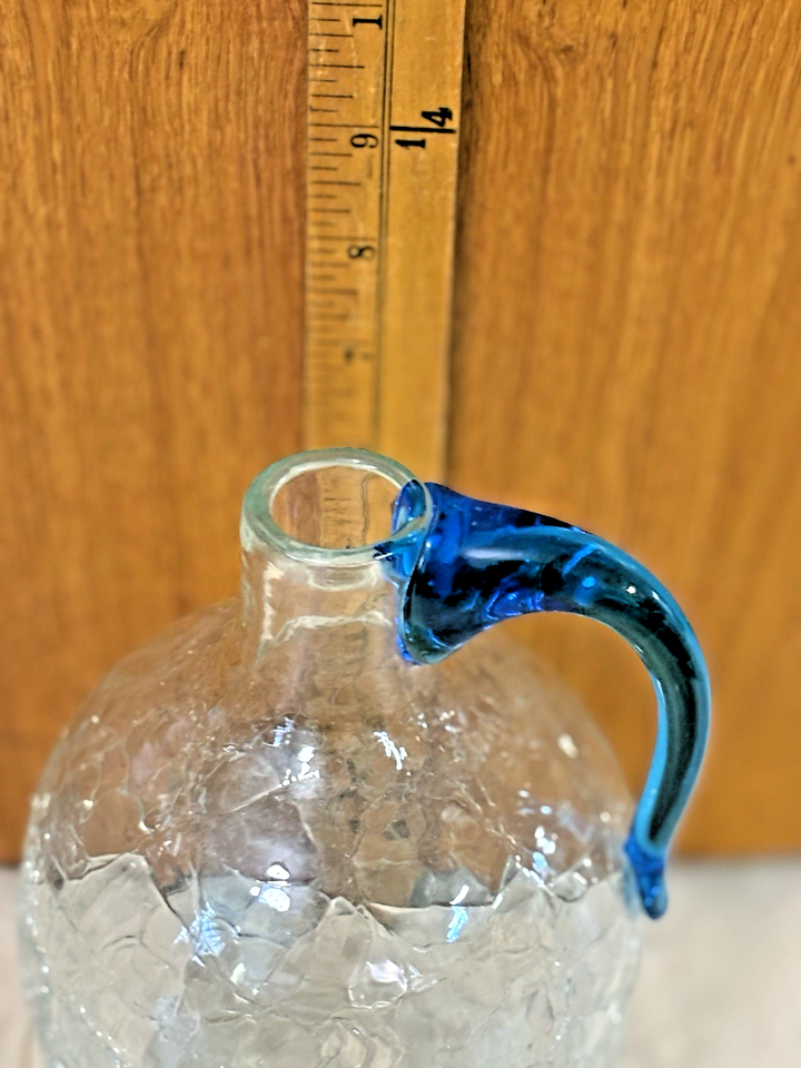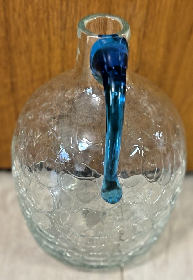 BLENKO ~ 1950s #417 Clear Crackle Hand Blown Glass Jug with Blue Handle