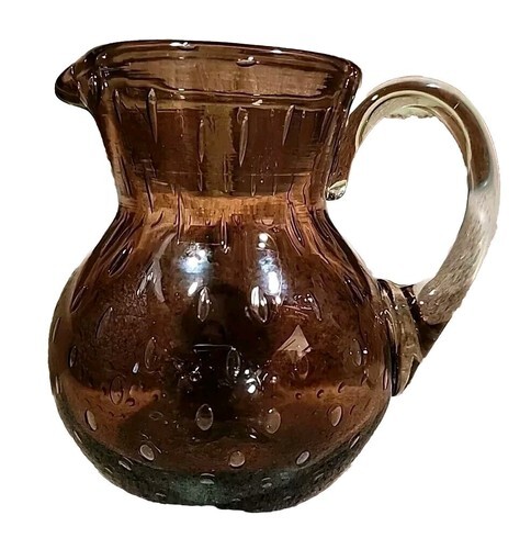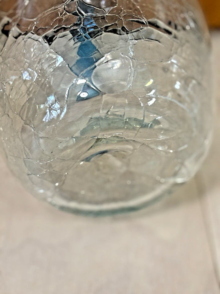 Up for bid is a BLENKO ~ 1950s #417 Clear Crackle Hand Blown Glass Jug w/ Blue Handle in Excellent Pre-owned Condition. There are no visible defects. In MINT CONDITION. Pleaase see all photos before making a bid.