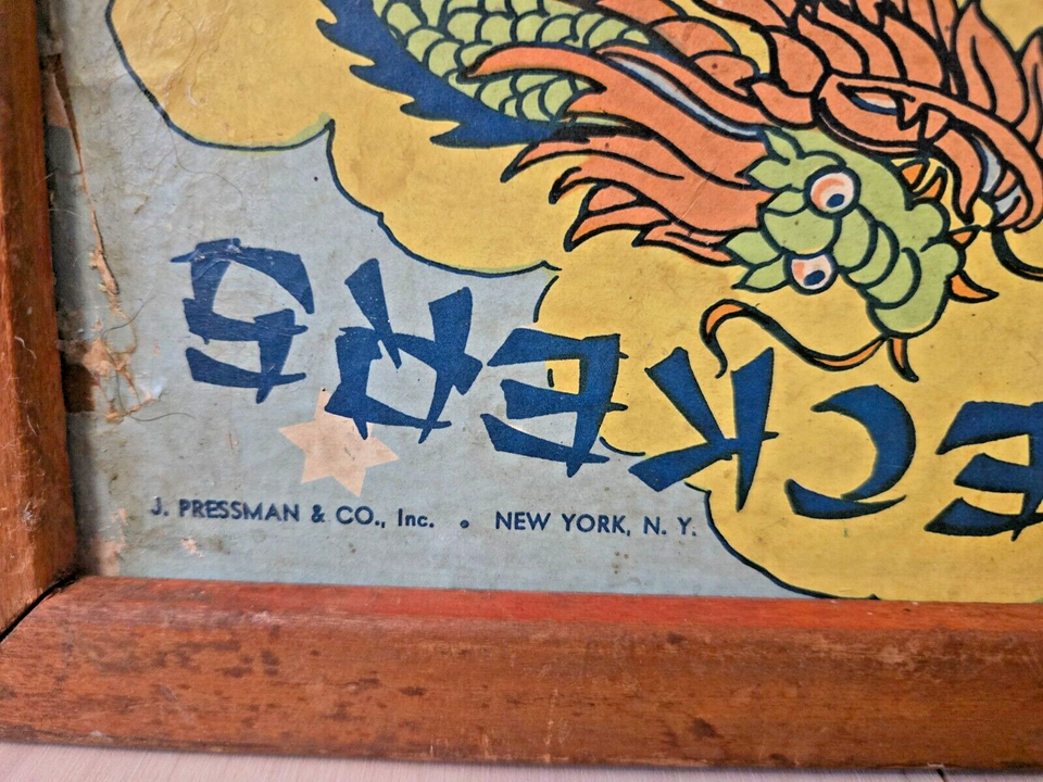 Up for bid is a Vintage Great Patina 1940's Chinese Checkers Hop Ching Board,J Pressman Co. There are signs of wear, use and age on both the wooden frame and the gameboard itself. Please see photos before making a bid.