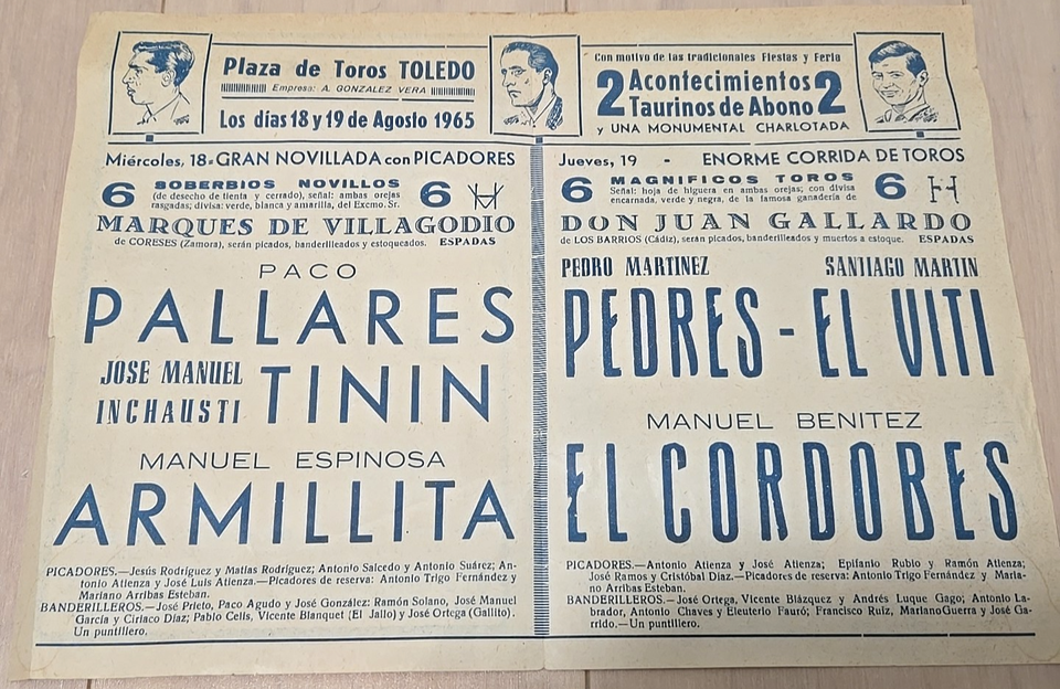 Up for bid is a 1965 bullfighting program from the Plaza de Toros de TOLEDO.