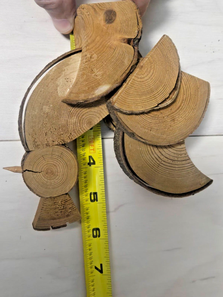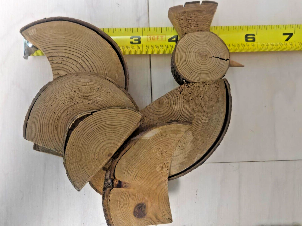 Up for bid is a handmade wooden Chicken/Rooster. It is constructed from individually cut pieces of wood and glued together. It is a rustic piece that is unpainted with the texture/ rings of the wood on display. See photos for condition and measurements