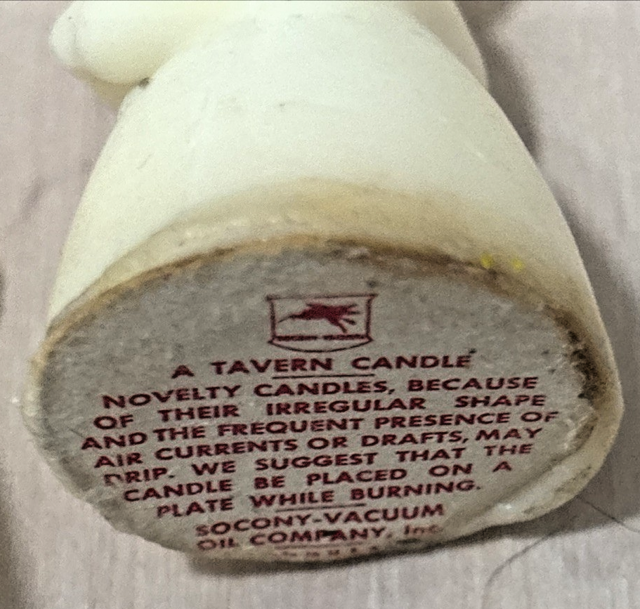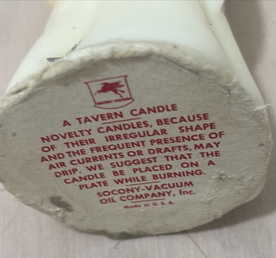 Some interesting background information: These candles were produced by the Socony-Vacuum Oil Company which is now Exxon Mobil. They were often sold at dime stores in the 1950's and were made from the excess paraffin from the oil refinery process.