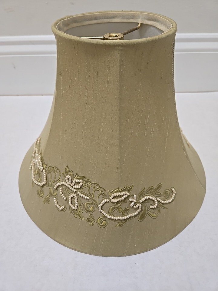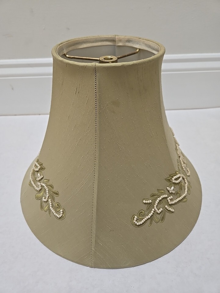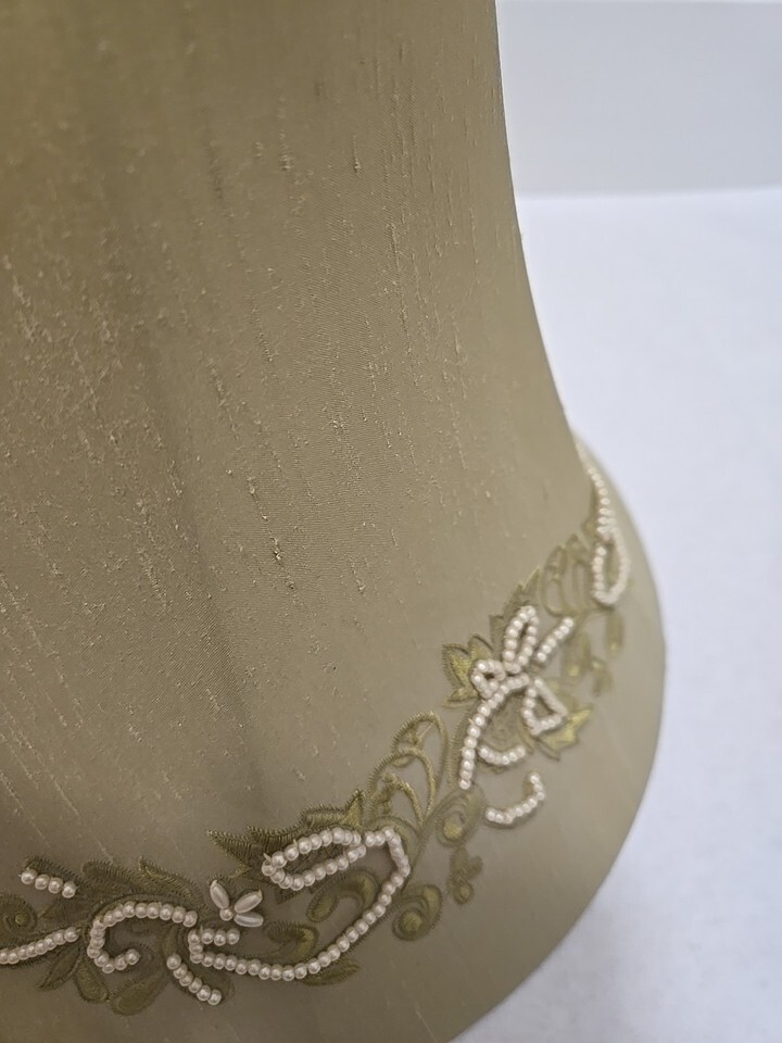 Light Olive Bell Shaped Lampshade w/Embroidery and Pearl Beads at the bottom