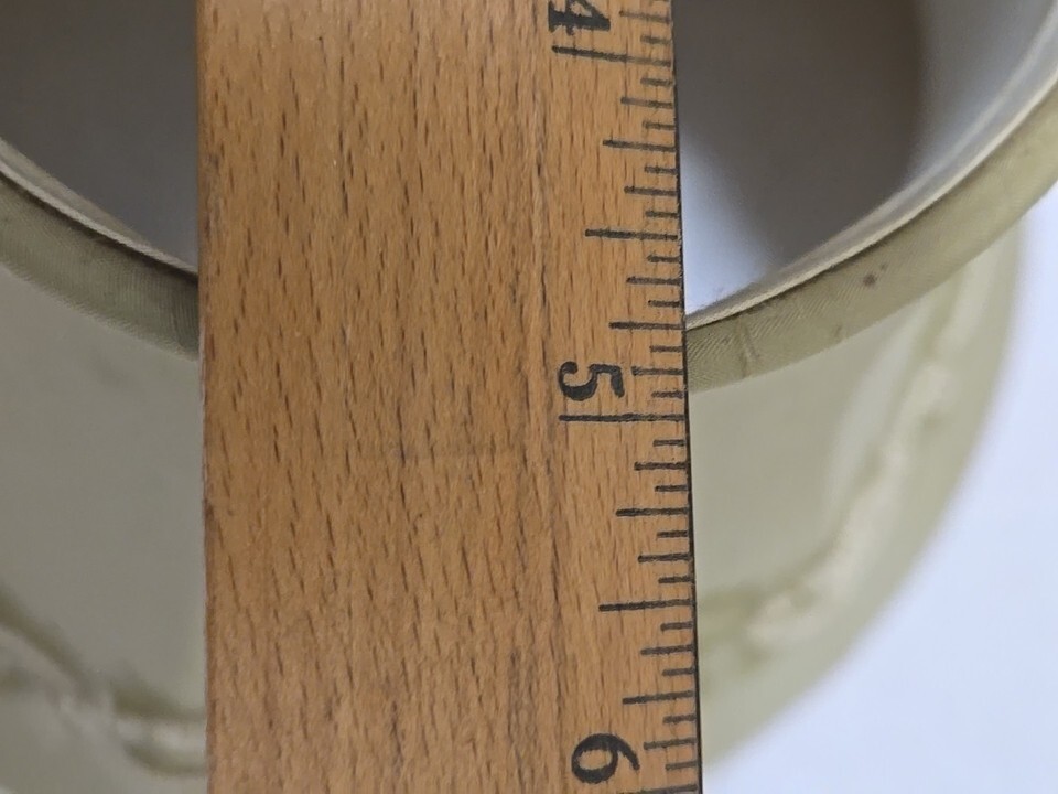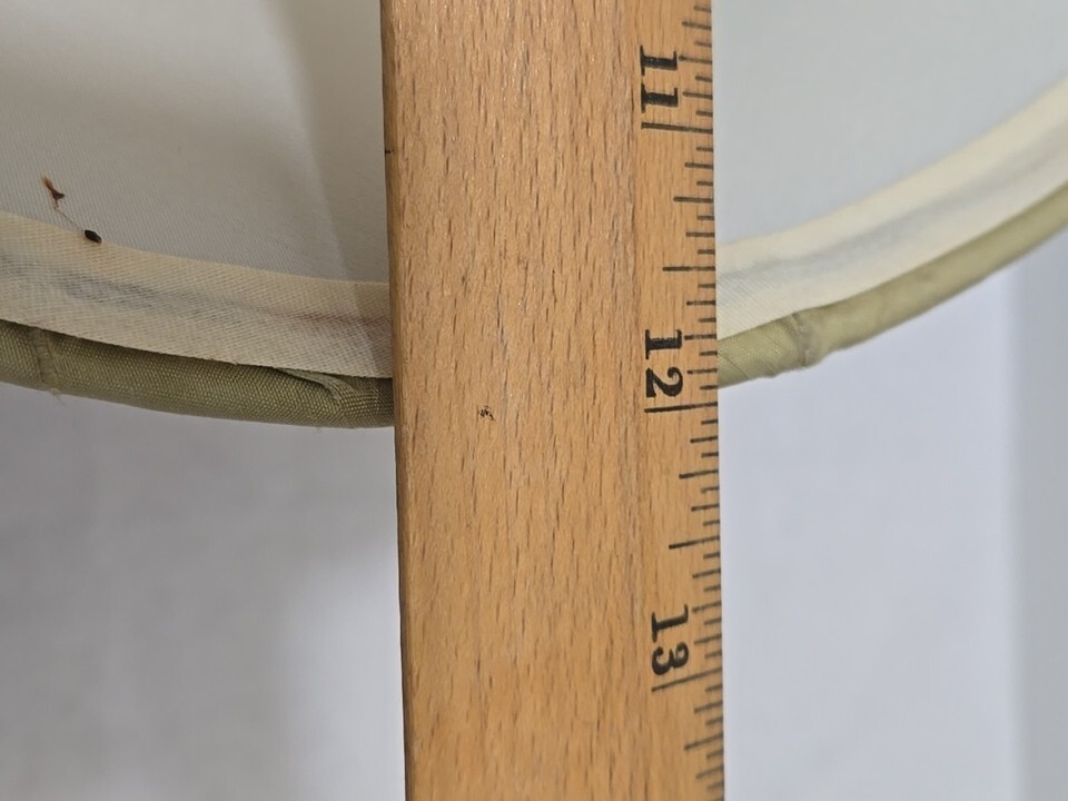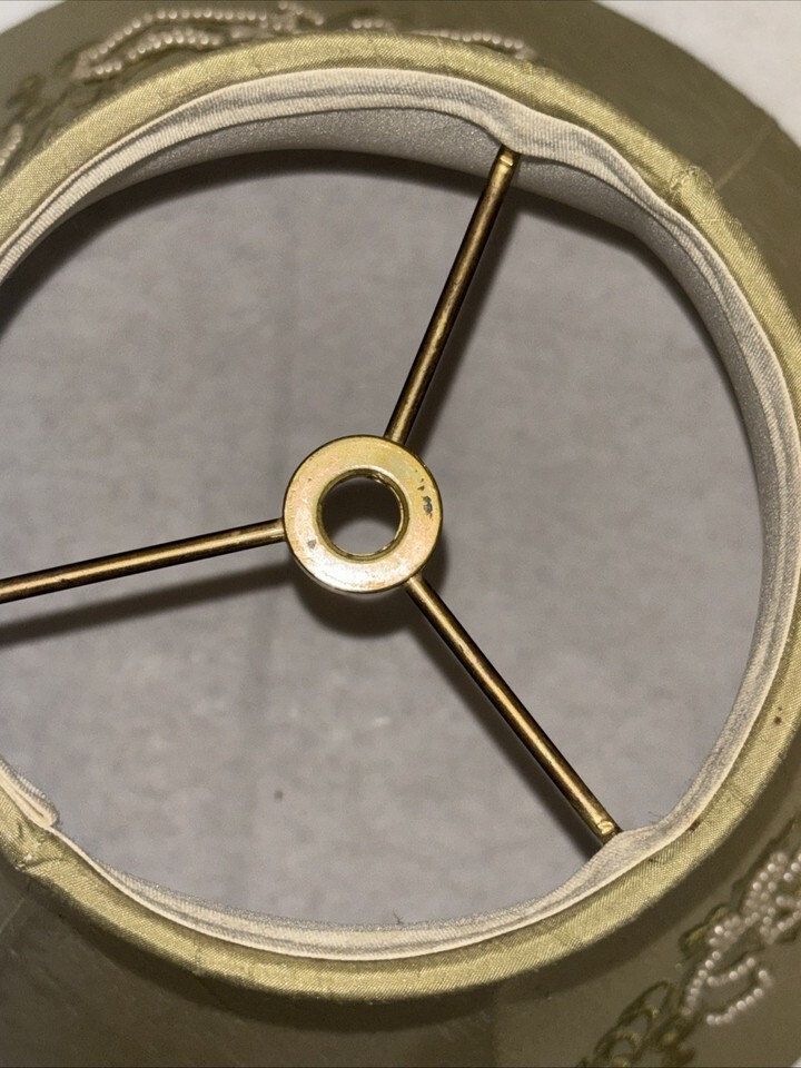 Up for bid is a Vintage Light Olive Bell Shaped Lampshade with Embroidery and Pearl Beads at the bottom. The fabric appears to be like a silk crepe de Chine -matte finish and texture. This is a pre-owned item with minimal signs of use. There is a brown "mark" on the white inside lining of the shade and some marks on the gold metal part of the lamp (the Spider Fitter); these defects are shown in the photos. The outside of the lampshade is in excellent condition and there are no defects. Please see all of the photos before making a bid and feel free to reach out if you have any questions