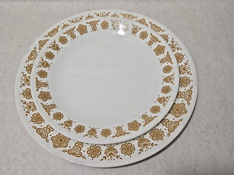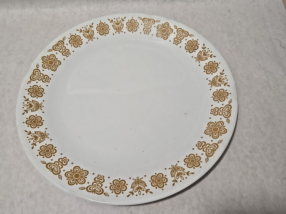 Up for bid is a Vintage Open Box Corelle Corning 5pc Place Setting in the Butterfly Gold Livingware pattern. The place setting includes a dinner plate, salad plate, a bowl, and a cup and saucer. The cups have the "hook handle". Although this set is in its original packaging, the box has some tears and discolorations. Please see all photos before making a bid.
