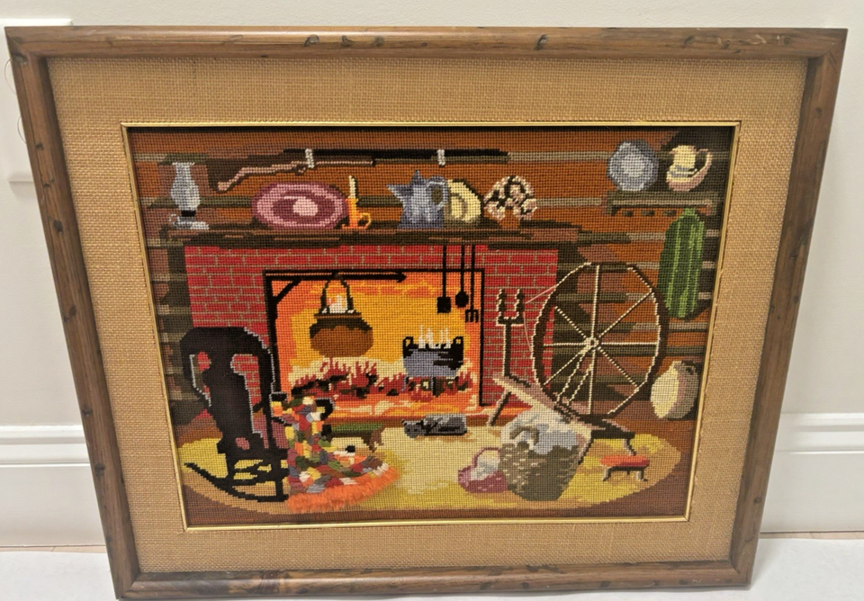Up for bid is a beautiful handmade framed (no glass) needlepoint picture of a cozy fireplace scene. It was completed on March 16, 1984 and given as a gift to an elderly aunt. The colors are vibrant but not too bright and the rustic scene promotes a sense of love, togetherness and calmness. The needlepoint work is flawless and it is framed in a knotty pine frame with an interior boarder of burlap.There is no glass so that the artistery can be viewed in a much more personal way. The needlepoint was beautifully framed professionally and will stand up for years to come. Please see all photos before making a bid and feel free to reach out with any questions.