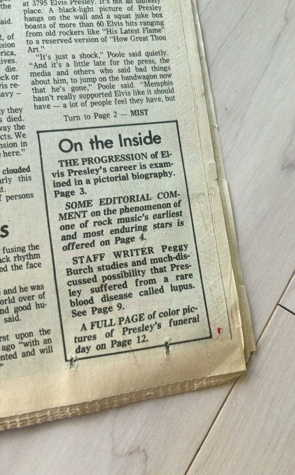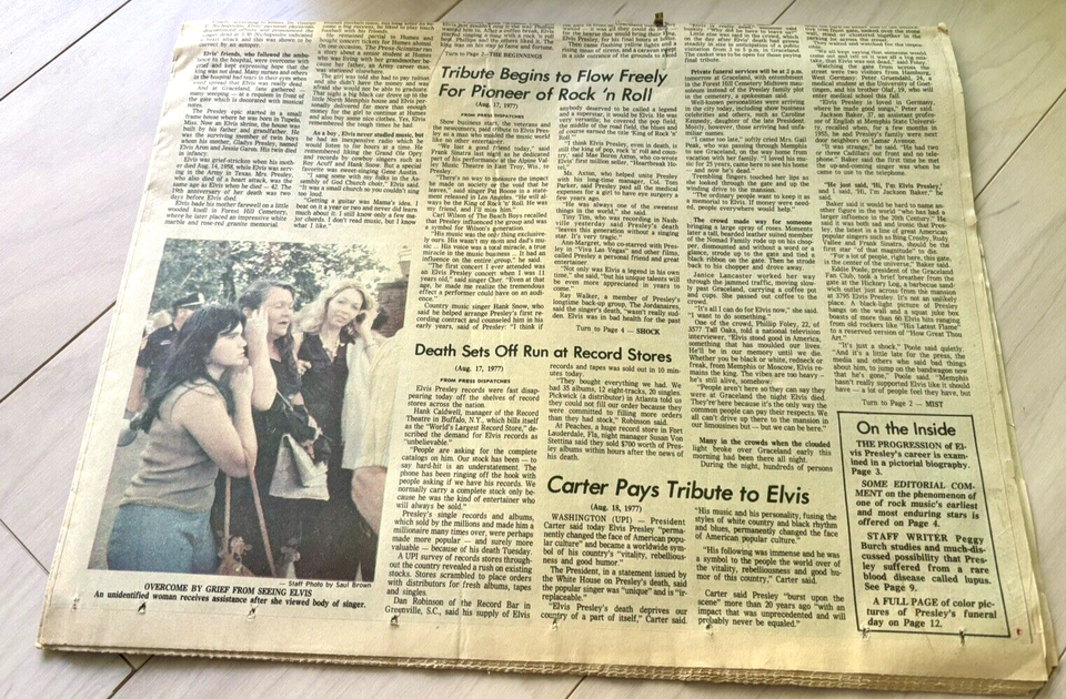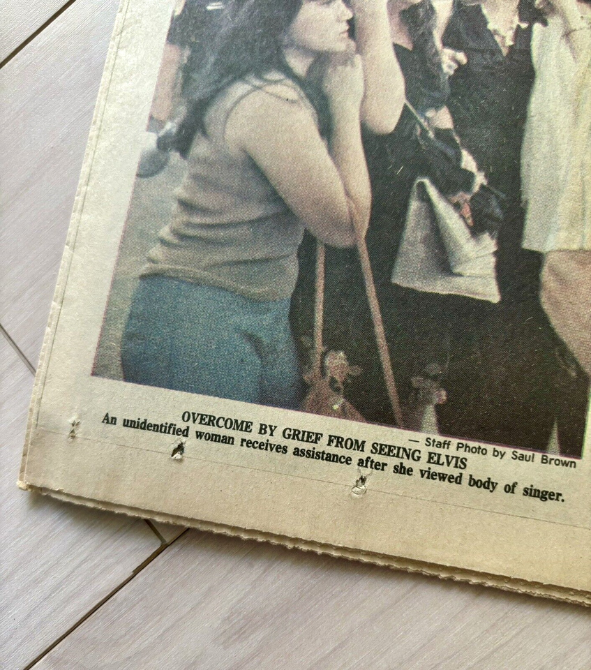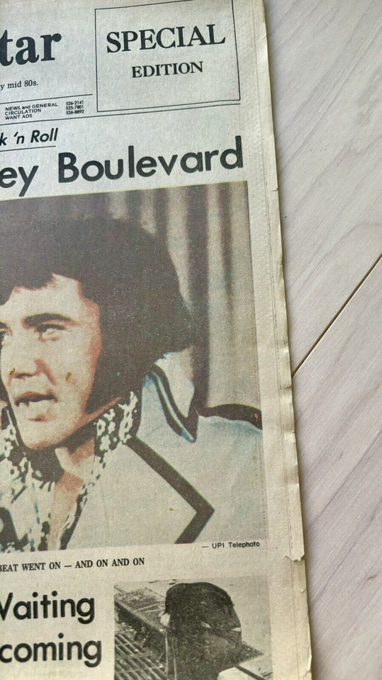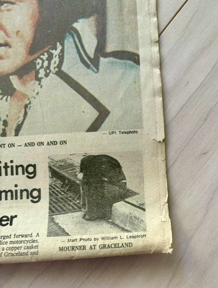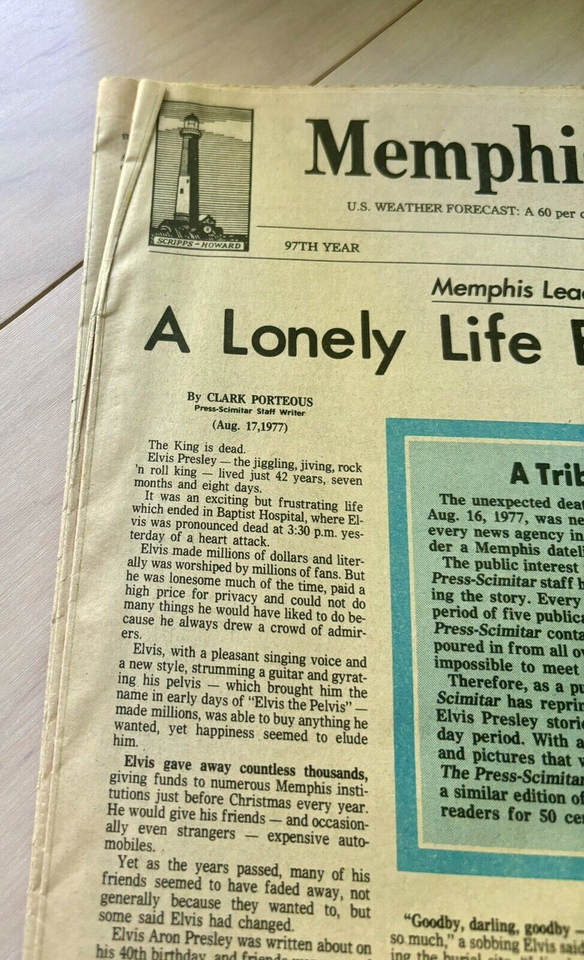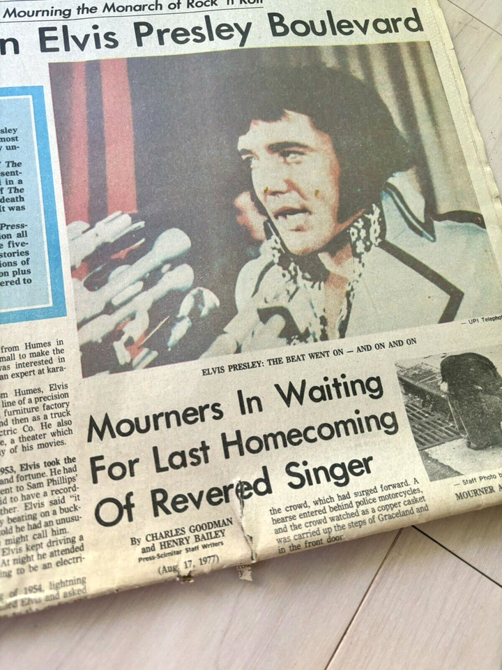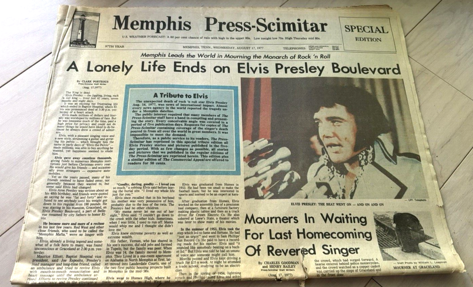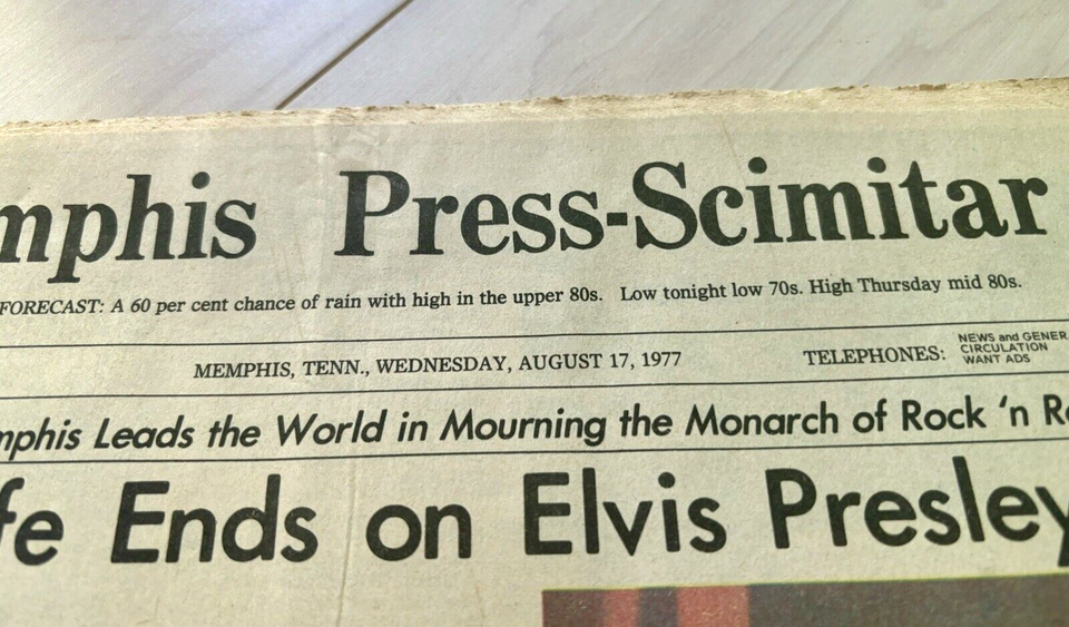 Up for bid is August 17th, 1977 special edition of the Memphis-Press-Scimitar newspaper whose headline is the death of Elvis Presley. Due to the age of the newspaper there is some yellowing, wear around the edges, and tears in the fold. Great piece of history that is getting harder to find.