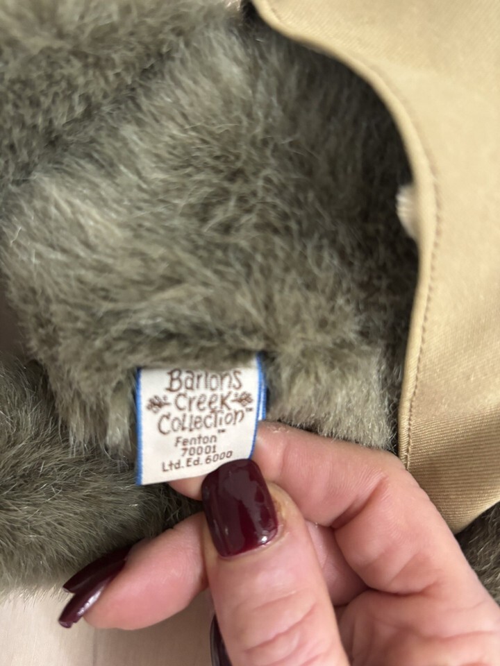 Fenton is ready to go fishing! He is wearing a fishing vest and carries a fishing pole with a fish and a net. His adorable hat is adorned with "lures" and feathers. This lovable bear is part of the Barton's Creek Collection. Gund 12" Fenton fishing bear. Created by artist Pat Kolesar. Simulated mohair exterior, fully jointed, with pellet filling. Painted resin face and accessories. Recommended for older children and adults due to choking hazzards. Please see all photos before making a bid.