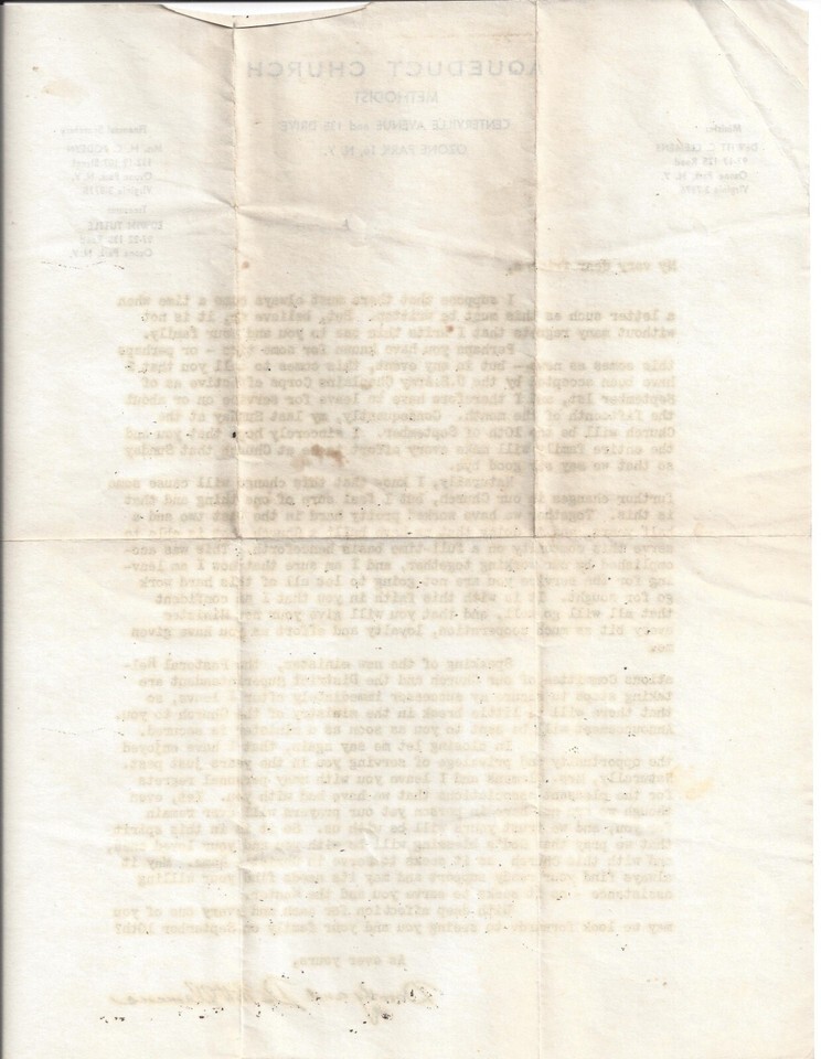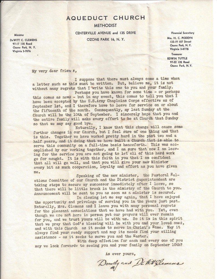 Up for bid is a rare undated, typed, signed resignation letter from DeWitt Clemens, who was a minister at the Aqueduct Church in Ozone Park, NY.
