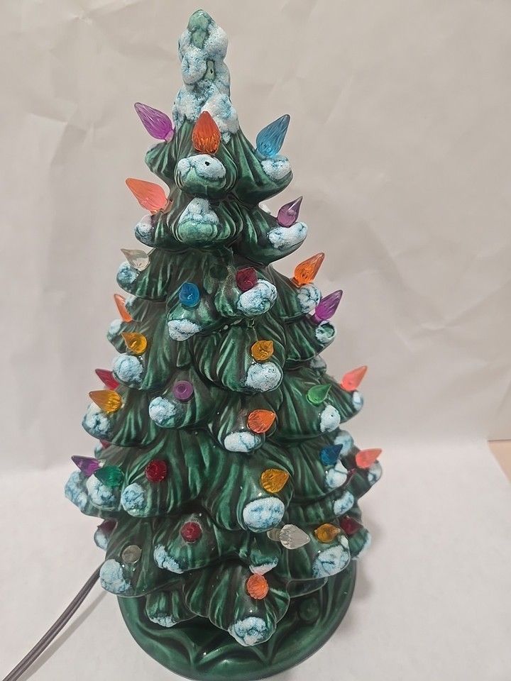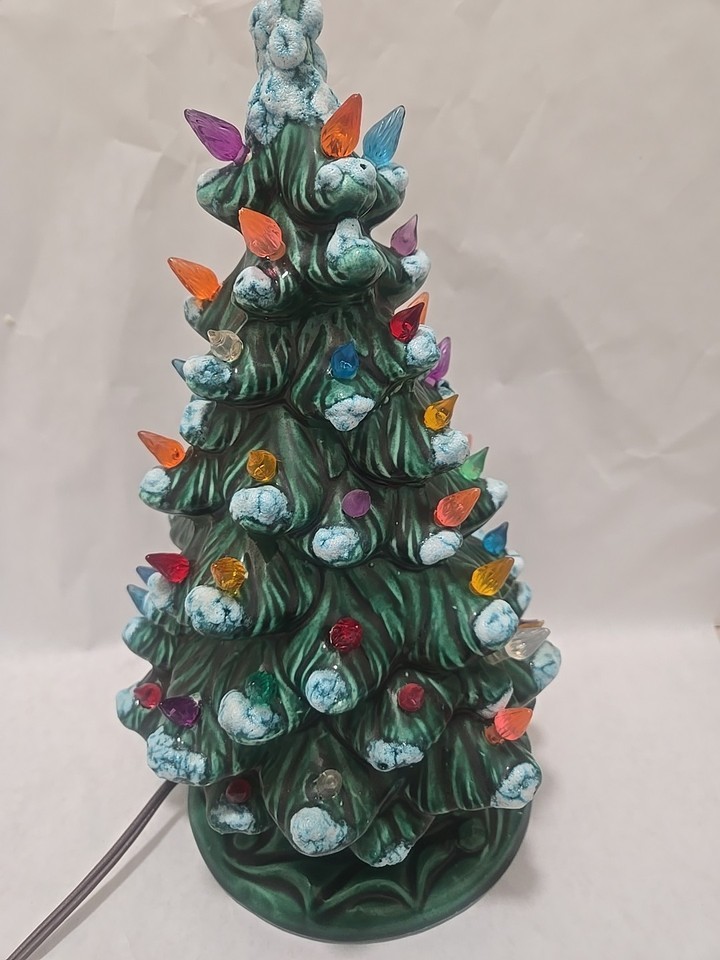 Up for bid is a Vintage 10.6 ? handmade ceramic Christmas tree with a base. It is a pre-owned Vintage item and there are the expected signs of use and wear. Specifically, the snow on the tree is missing in some areas. Please see all of the photos before making a bid and feel free to reach out with any questions.