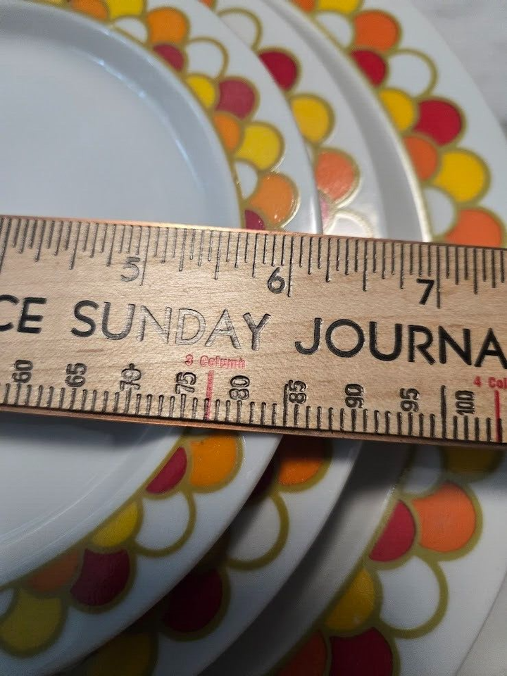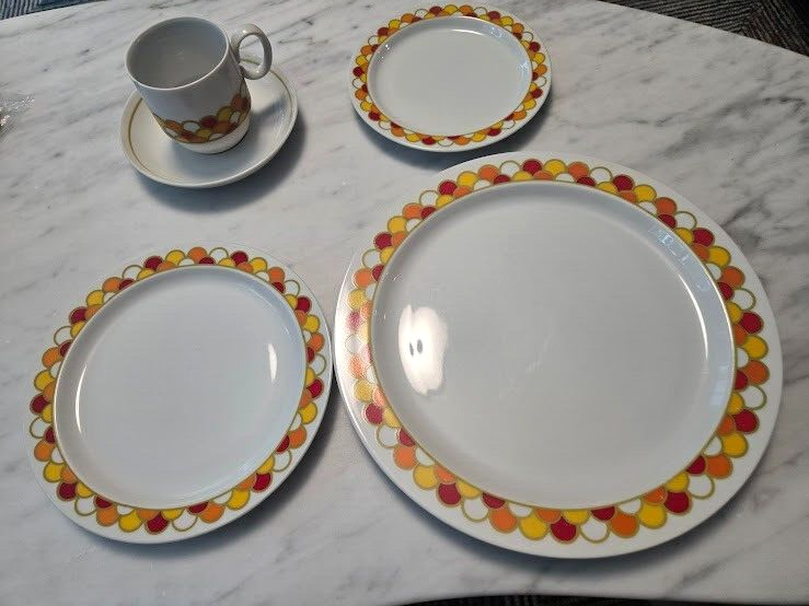 Up for bid is a Vintage Georges Briard Carousel pattern five piece setting. The pieces in this place setting are: a dinner plate (10 1/4 inches), a bread plate ( 6 1/4 inches), a salad plate ( 7 3/4 inches), a coffee/tea cup (3 inches), and a saucer (5 1/2 inches). It is a beautiful fine china MCM pattern of orange and yellow circles with a gold outline. The gold outline has been described as having a green tinge to it, and the overall pattern of the dishes has been described or referred to the "fish scales" pattern.