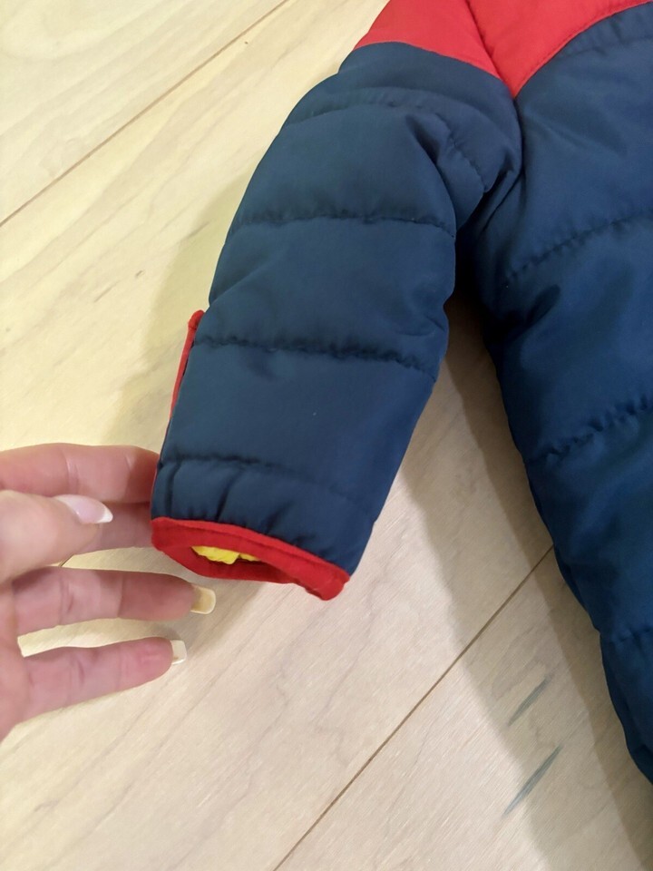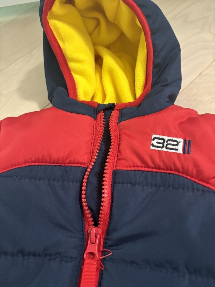 Up for bid is a NWT WeatherProof 32 Degrees Performance Baby Boy one piece snowsuit. The snowsuit is size 3-6 months , the exterior is blue and red with a red zipper and the fleece lining is yellow.