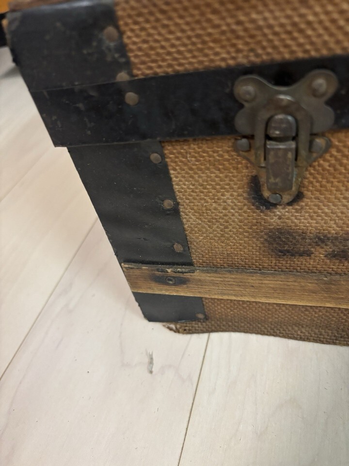 Up for bid is an Antique Children's Toy Doll Steamer Trunk with the following dimensions: 14? x 8? x 7?. This is an antique item that has significant signs of use, wear, and tear. It is made from wood, metal, and burlap, and the inside is lined with paper. There is damage to all of these materials, but it simply adds to the charm of this trunk. Please see all photos before making a bid and feel free to reach out with any questions.