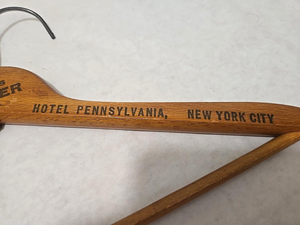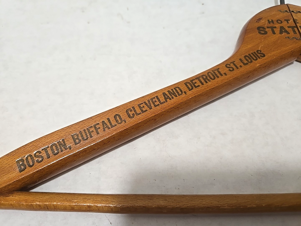 Up for bid is a double sided wooden clothes hanger that came from a Statler hotel.