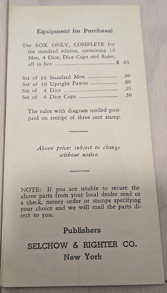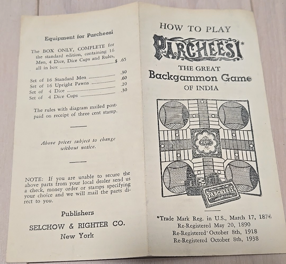 Up for bid are the instructions from the Selchow Righter designed board game Parcheesi