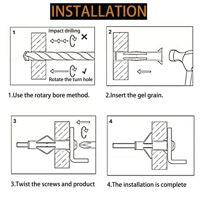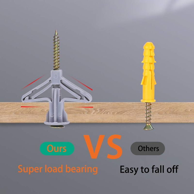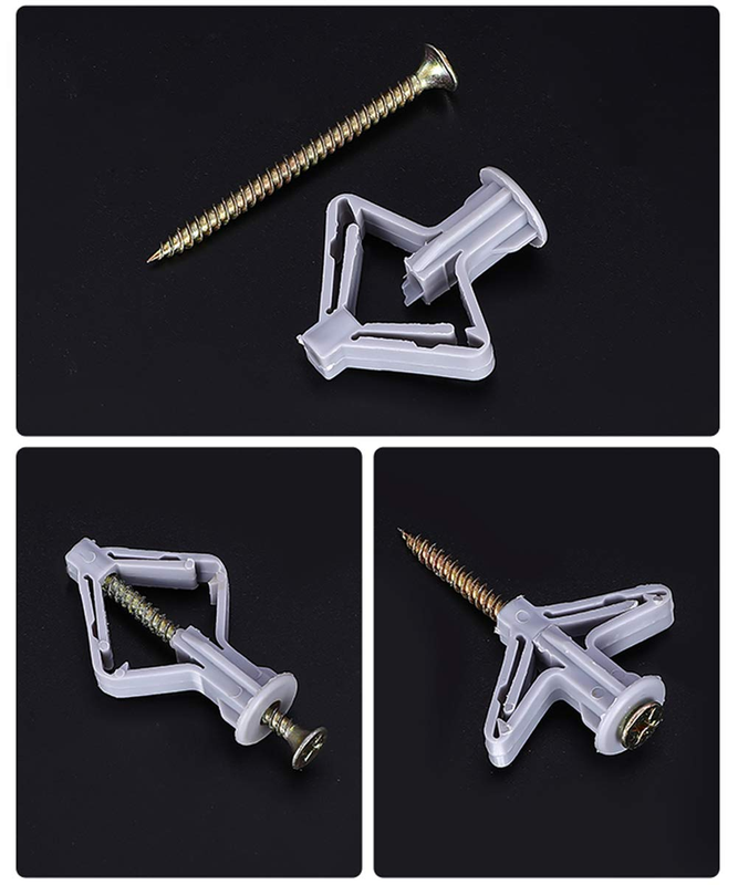?Structure? When tightening the screw, the gap in the ribbed anchor is expanded on two opposite sides to increase the fixing force. The anti-rotation structure design of the expansion sleeve will not follow the tightening of the screw when the drill is rotating.The drywall anchors and screws kit can expand strongly in all hollow environments.