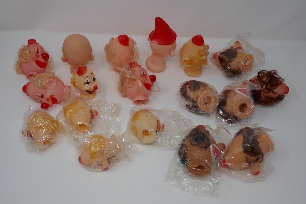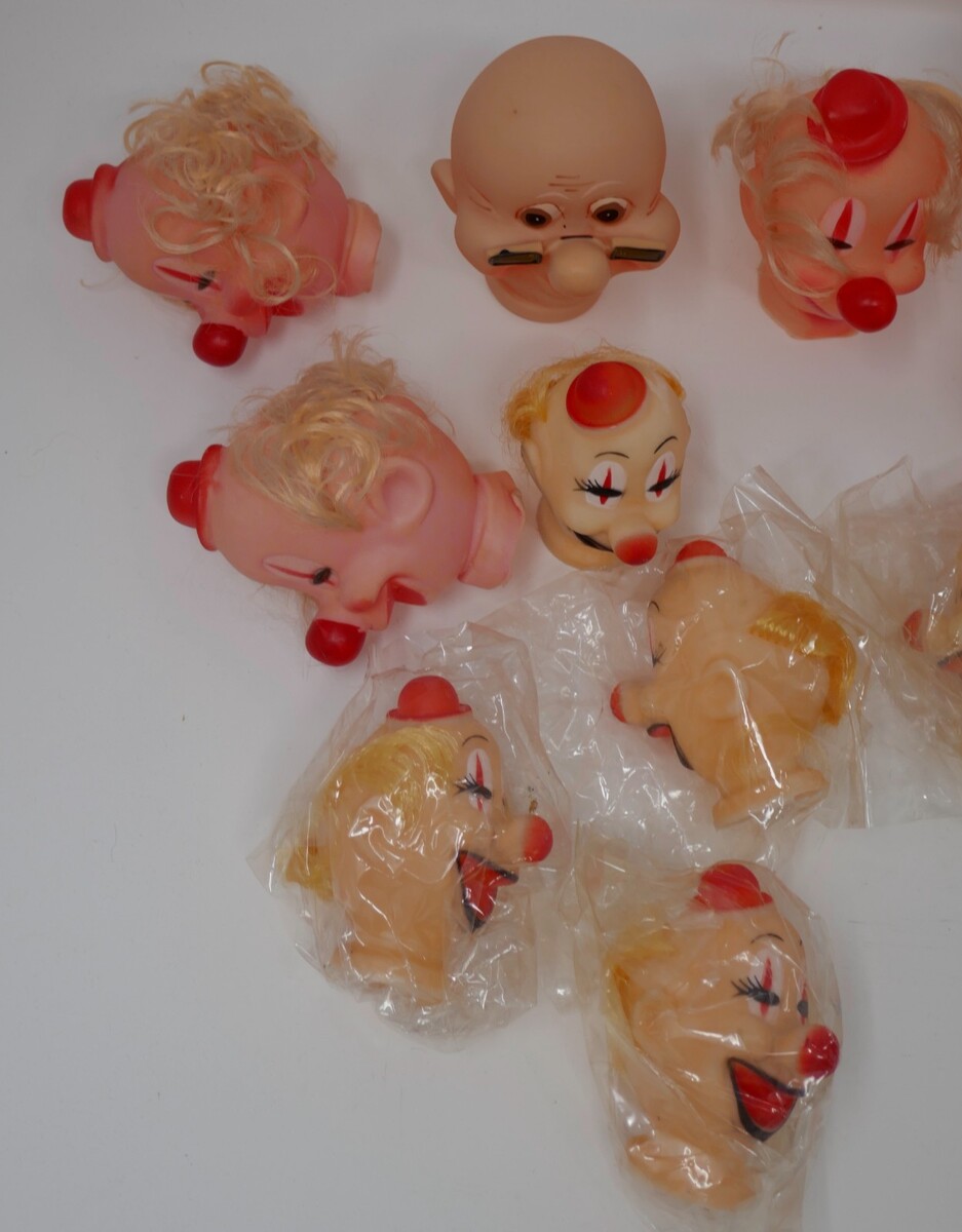 This lot of vintage clown doll heads features Emmett Kelly style figures with multicolor vinyl material and rooted hair. The set includes 18 heads in varying colors with light complexion and black eyes, perfect for adult collectors. These measure between 2.75" to 5" tall with some in open plastic bags and some with marks. Each head is a unique vintage find, adding a touch of nostalgia to any collection.