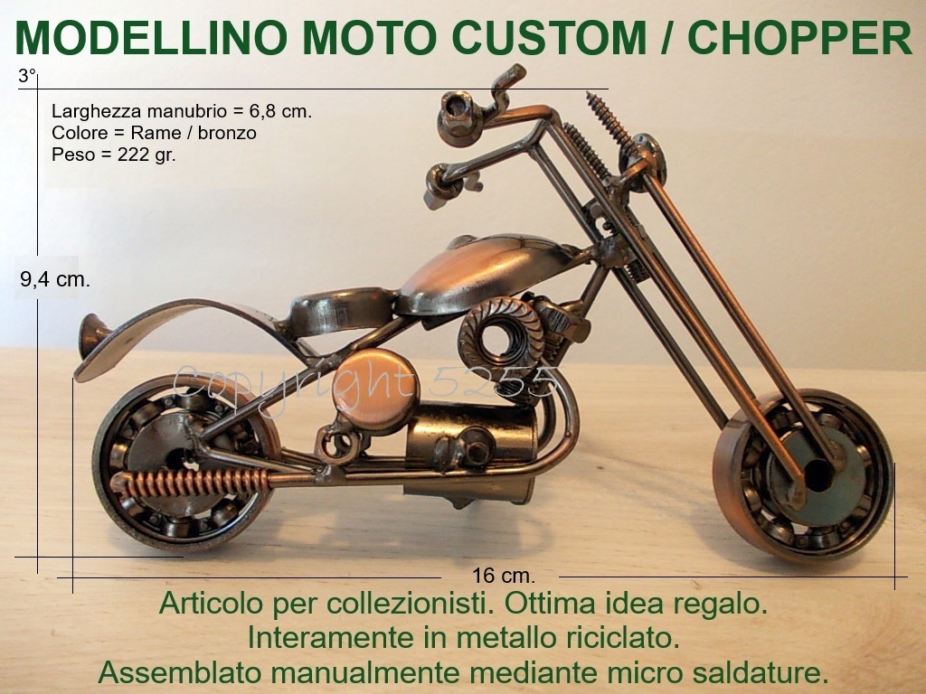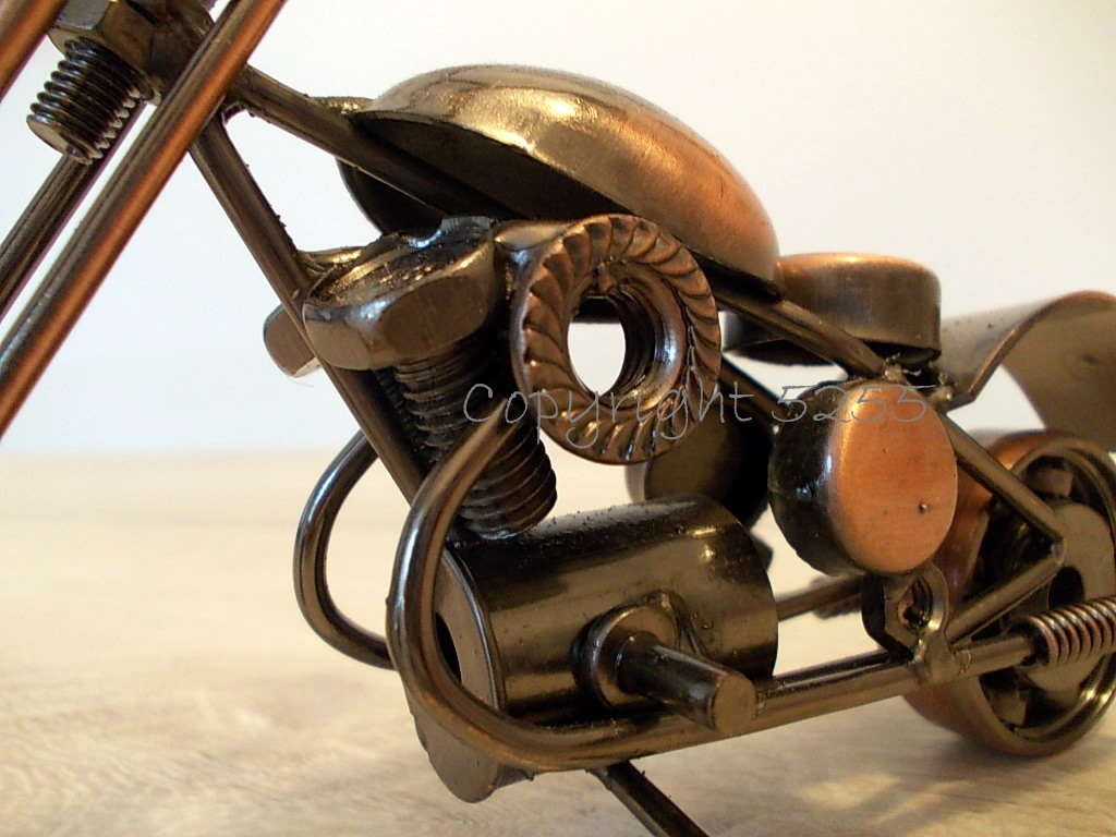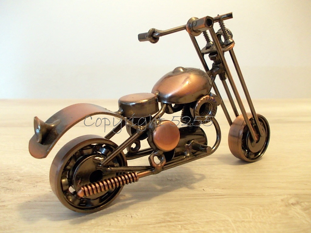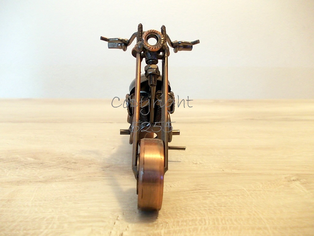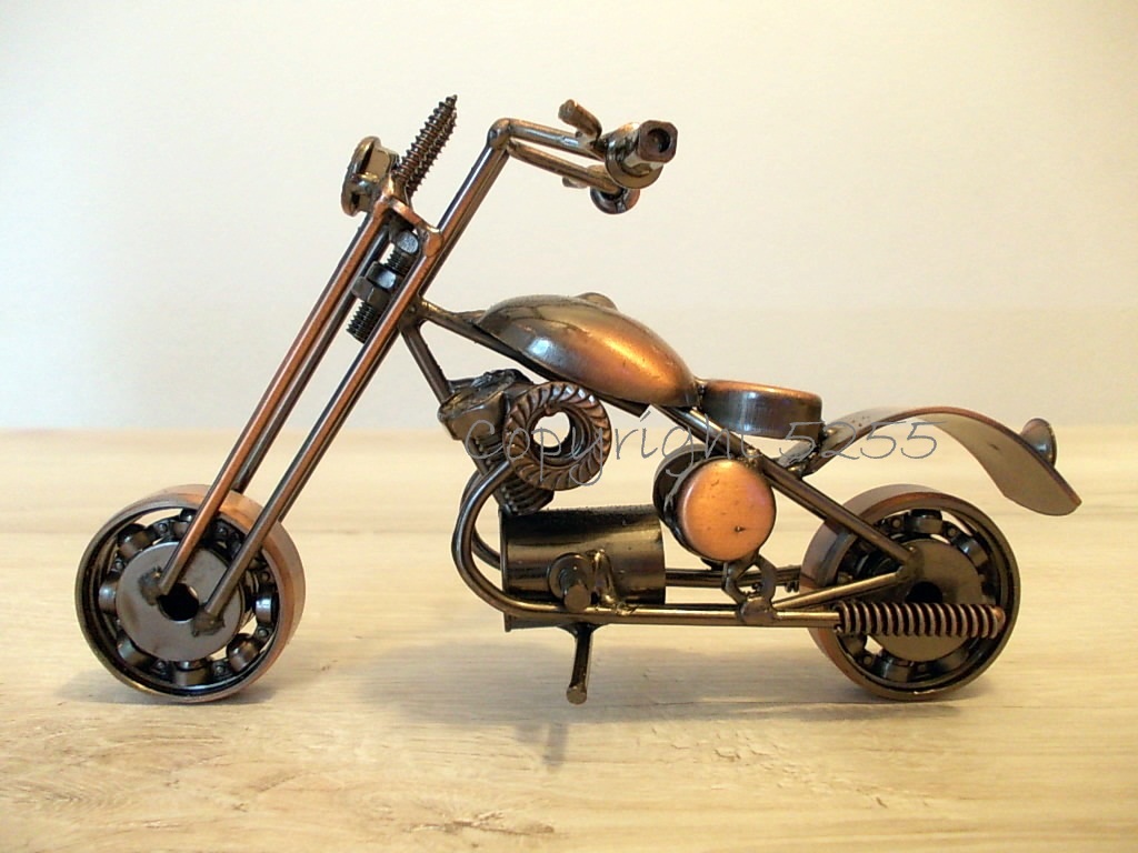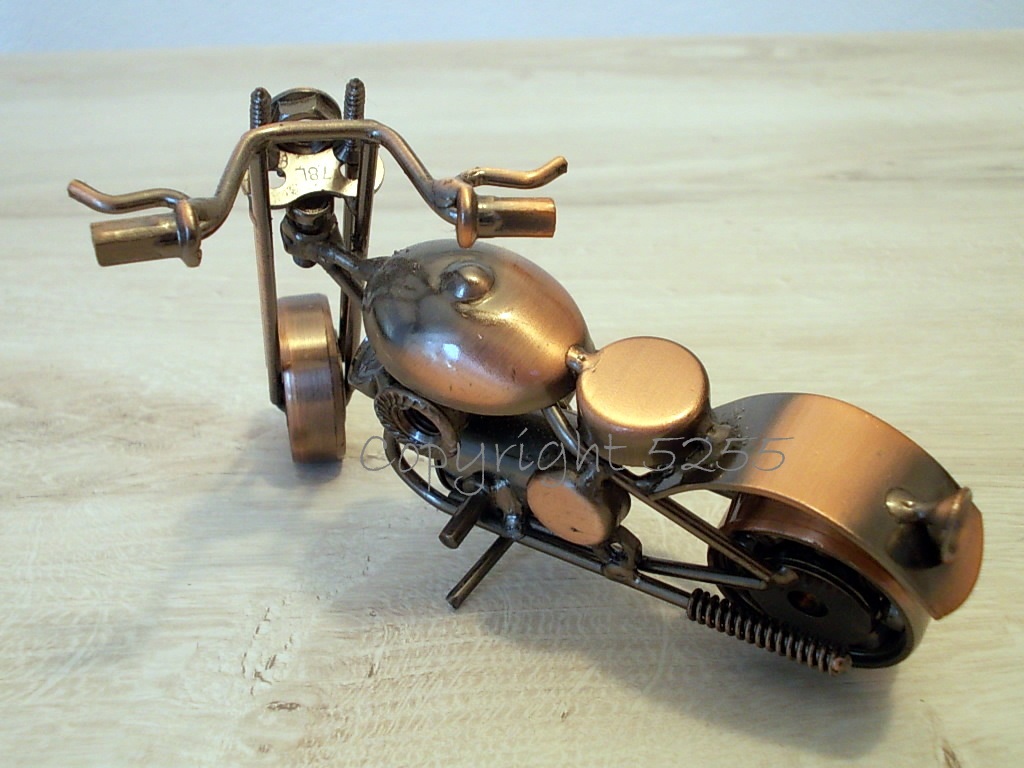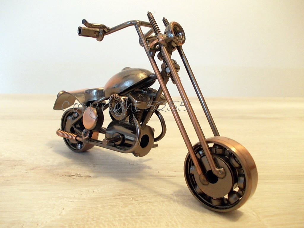 Modellino MOTO CUSTOM CHOPPER USA stile HARLEY DAVIDSON HD da collezione fatta a mano con micro saldature utilizzando del metallo riciclato: cuscinetti a sfera per le ruote, viti per la forcella, rondelle per il poggiaschiena, rivetti per le manopole, bulloni per i cilindri, dadi per i fanali, molle per i tubi di scarico e tanto altro.