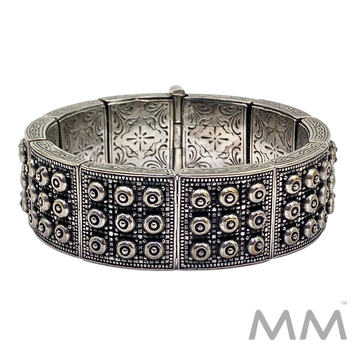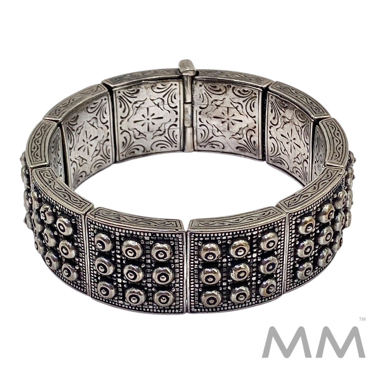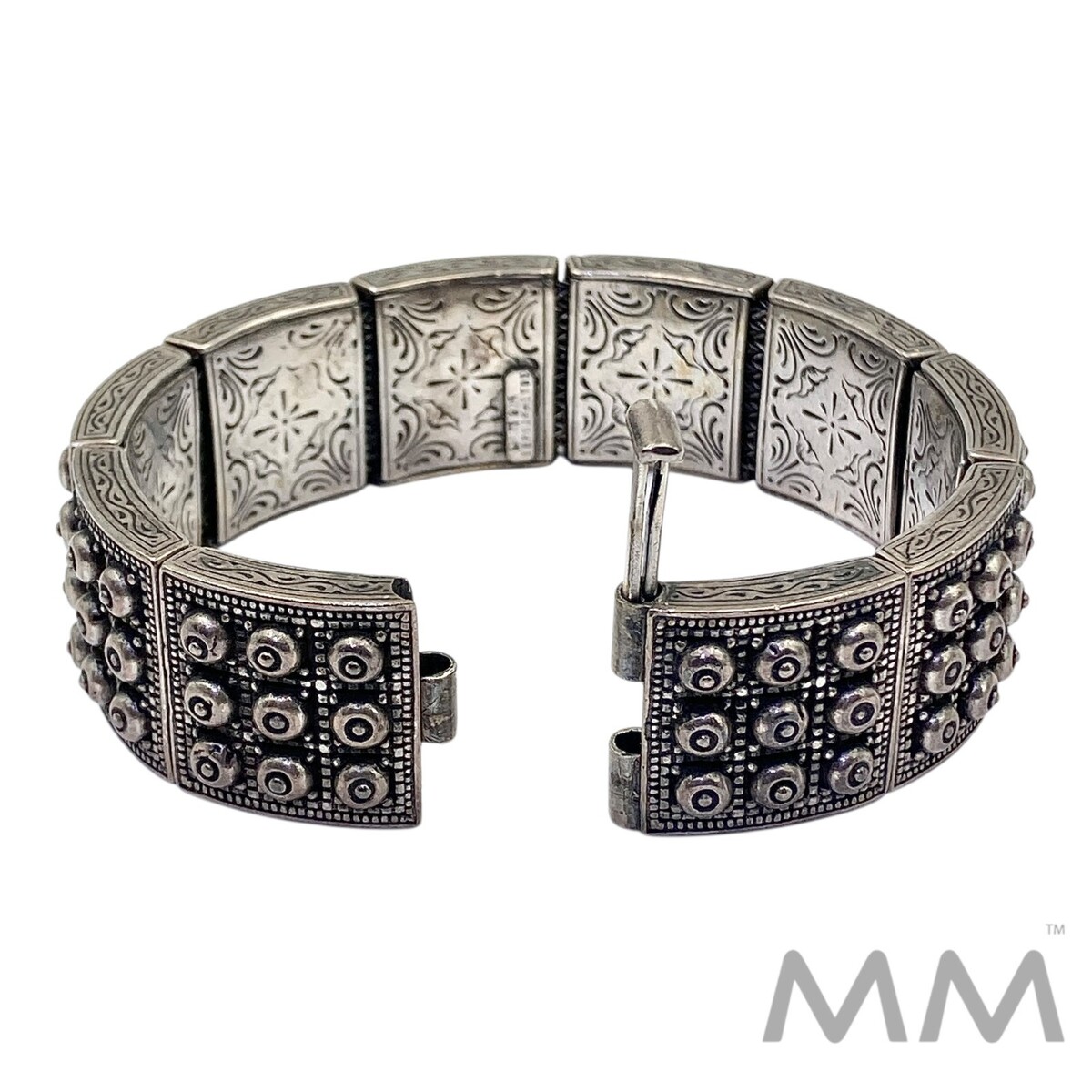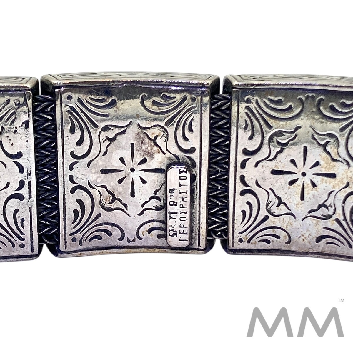 Ornate, heavy wide link intricately handmade silver bracelet. Item is signed; appears to be of Greek origin.
