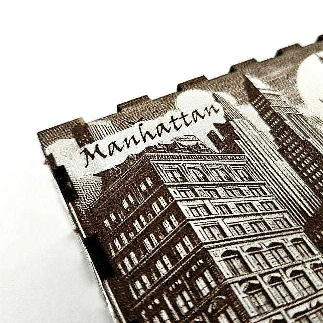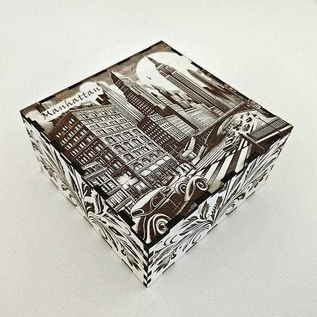 Handmade wooden box with laser-engraved Manhattan-themed design