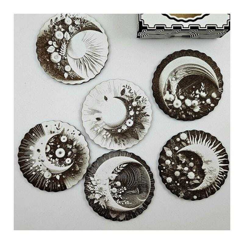 6 moon-themed wooden coasters